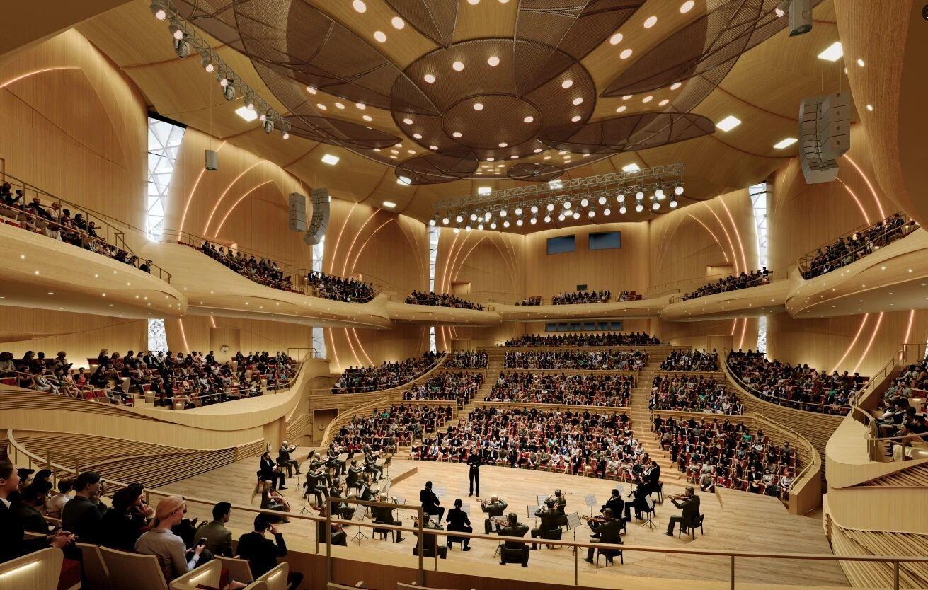 除主厅外,音乐厅还配有多功能厅、滨河步道露天剧场等多样化空间,可满足不同规模的演出与公共活动需求。项目整体建成后,将整合文化演艺、商业休闲与公共服务功能,打造集艺术体验与市民活动于一体的城市文化综合体。