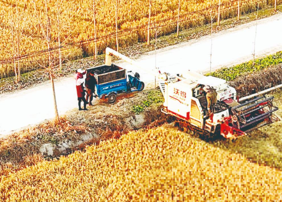 图为11月26日,在辛庄镇稻田畔,收割机正把新收的稻谷卸进农户车中。种植户趁着晴好天气,纷纷忙着收割水稻、晾晒稻谷,确保粮食颗粒归仓。