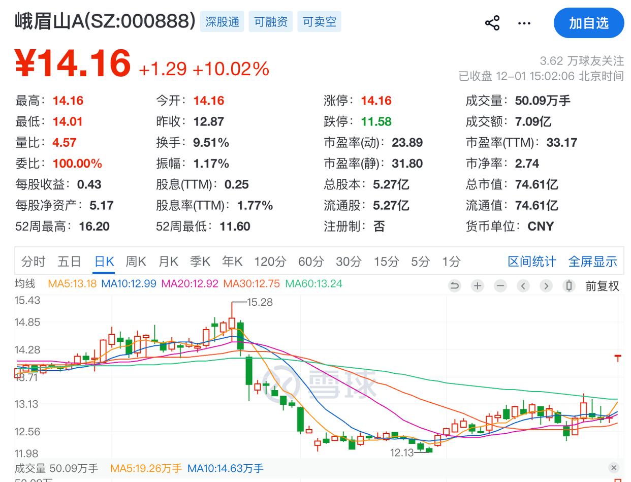 微成都注意到,根据公开信息,峨眉山门票为160元/人,万年索道单程票为45元/人。以11月28日收盘价计算,峨眉山每股价格为12.87元,投资者持有500股的成本为6435元,若有股民在当日尾盘买入500股,截至发稿,今日已浮盈约640元。