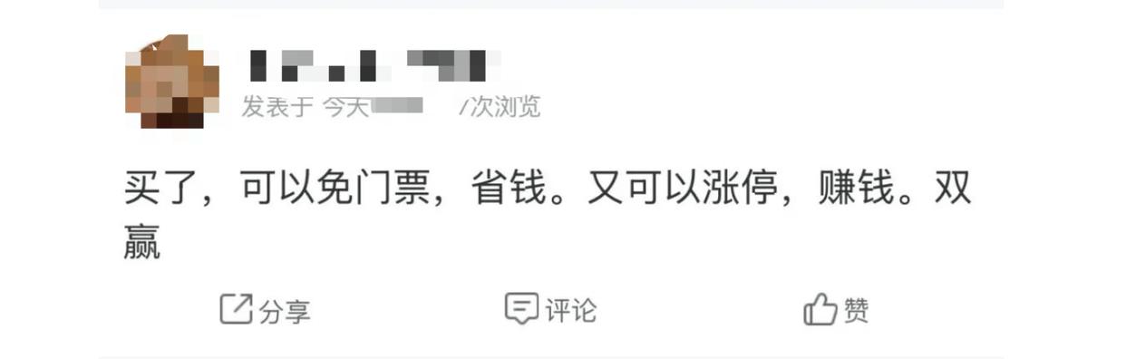 “既回馈社会,又拉动股票。”投资者在股吧发帖表示,持股500股就能免门票、索道打对折,带家人泡温泉、滑雪都能薅羊毛,“已经下单,500股买不了吃亏。”“买了,可以免门票,省钱。又可以涨停,赚钱。双赢。”