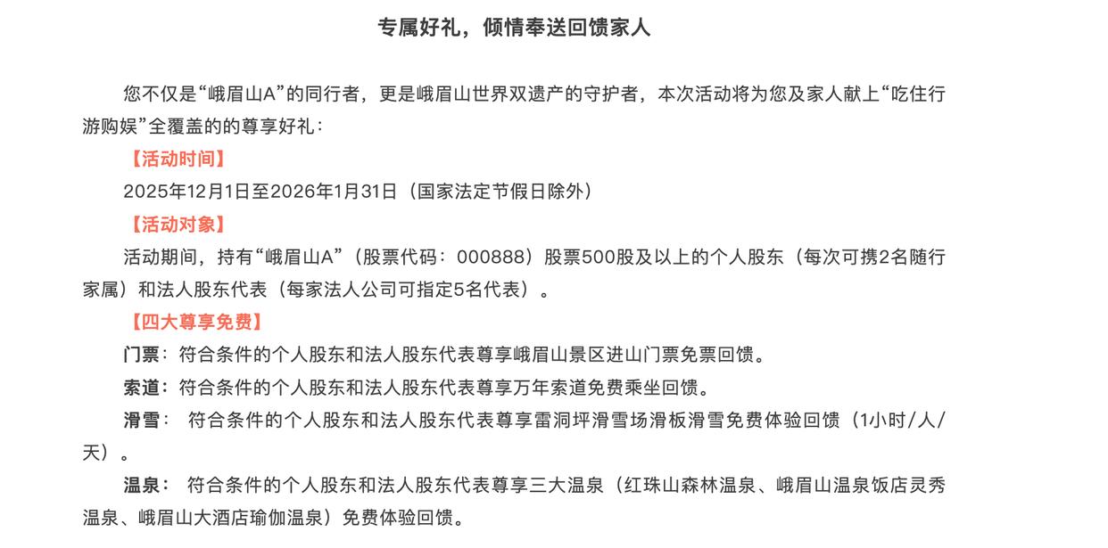 11月28日晚,峨眉山A公告称,公司将开展股东回馈活动。根据峨眉山景区11月30日最新消息,2025“峨眉山A”股东专属福利回馈于12月1日正式启幕。股东本人及法人指定代表可享受进山门票、万年索道、三大温泉全免,每天还可获得1小时免费滑板滑雪体验;随行人员也可享受门票及索道5折、温泉4—5折、滑雪5折等优惠。此外,合作酒店住宿2折起、“峨眉雪芽”茶叶买一送一、“峨眉记忆”文创产品8.5折等福利,进一步拓展了权益范围。