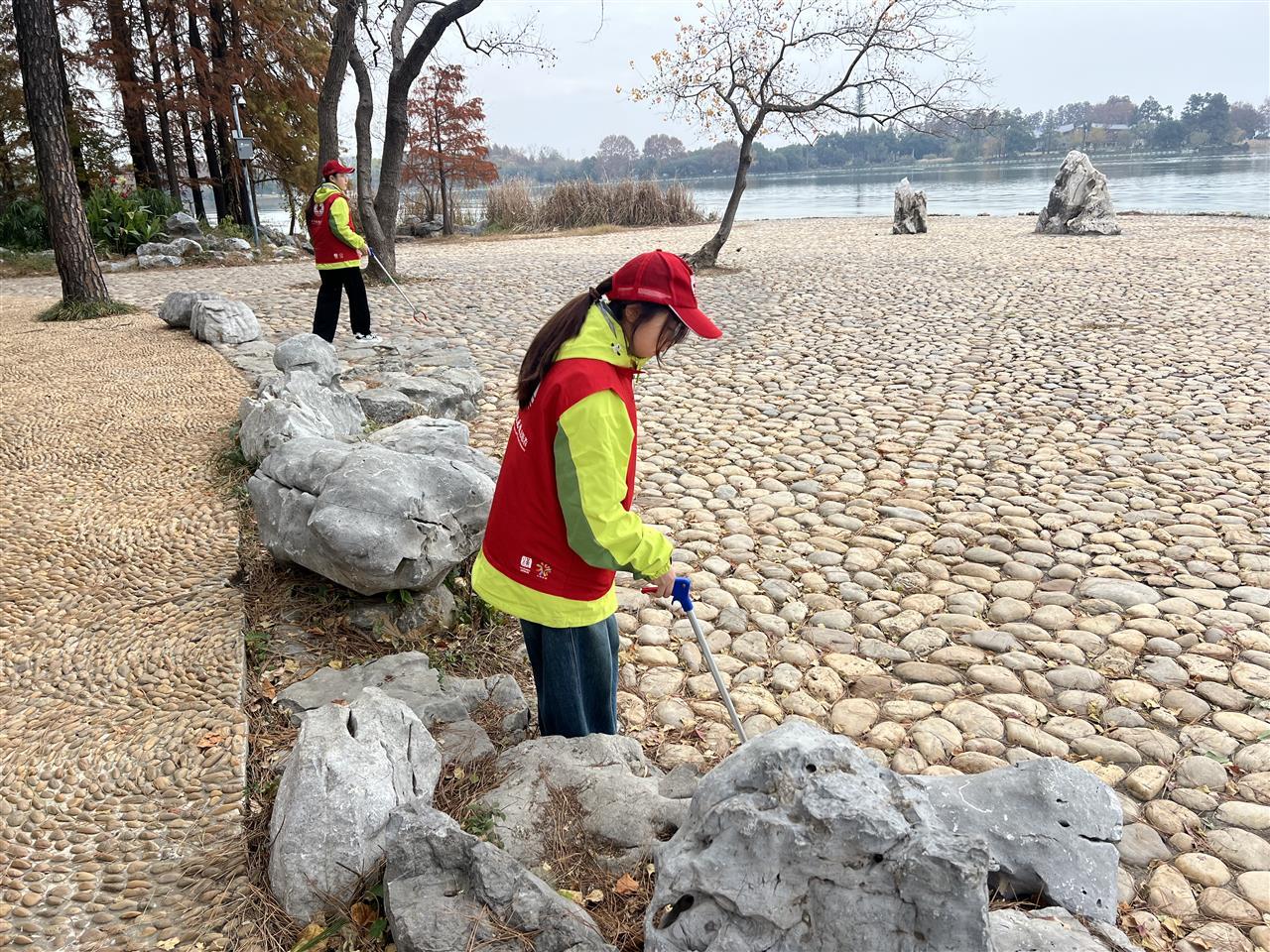 除了服务游客,志愿者们还化身景区“美容师”,有条不紊地开展轻量生态修复工作。他们俯身清理步道旁的枯枝败叶,细心捡拾角落里的废弃物,同时不忘温馨提醒过往游客,爱护湿地脆弱植被,守护共同的自然家园。