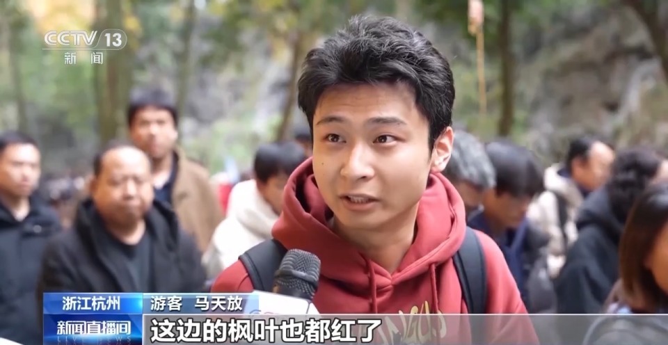 浙江杭州飞来峰景区12月1日开始免票,这个时节,景区内层林渐染的红枫成为冬日亮眼的风景,吸引不少市民、游客来此游玩。