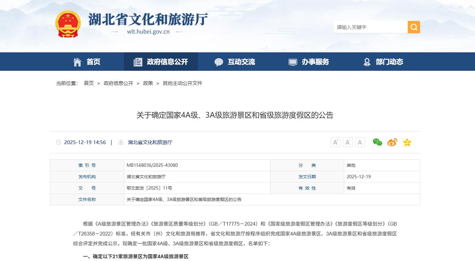 日前,湖北省文化和旅游厅发布公告,依据《A级旅游景区管理办法》《旅游度假区等级划分》等相关标准,经市(州)文旅局推荐、省文旅厅综合评定及公示等程序,确定21家景区为国家4A级旅游景区、1家景区为国家3A级旅游景区,6家度假区为省级旅游度假区。
