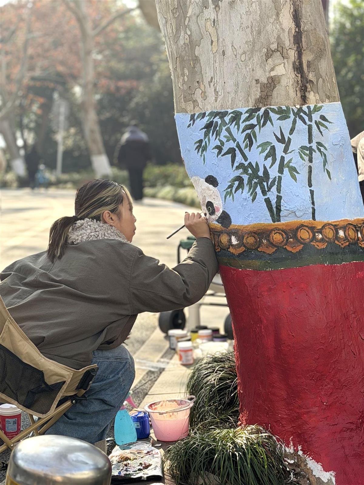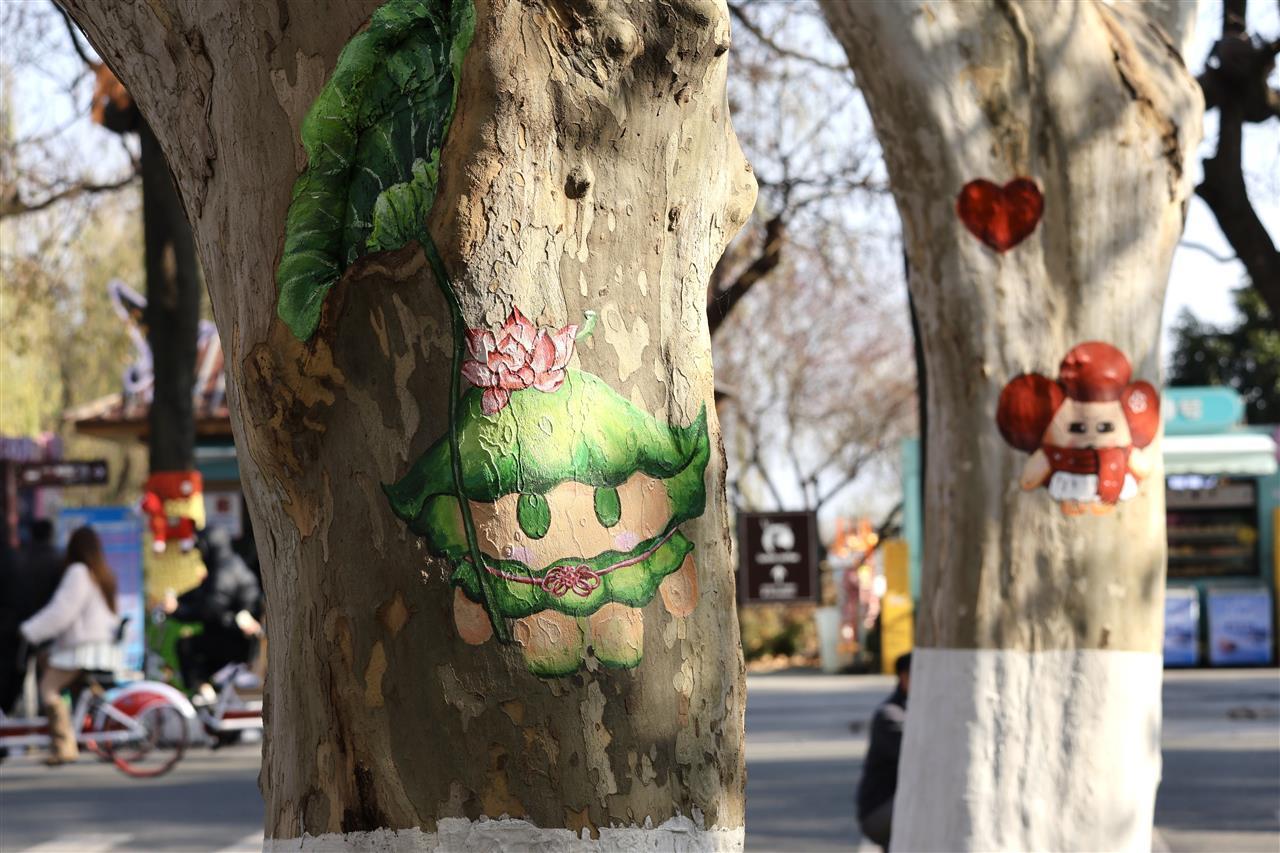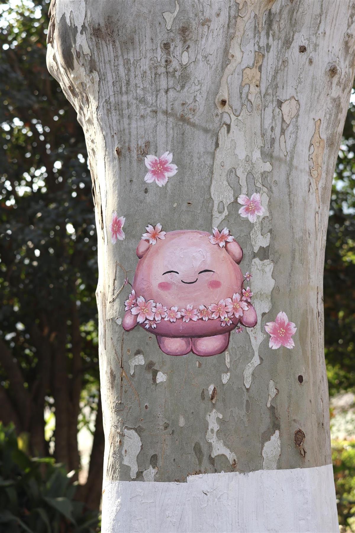 在楚风园、九女墩、氦气球、沙滩等湖中道沿线,约20棵大树正经历一场艺术变身。画师们以环保丙烯颜料为“化妆品”,结合每棵树独特的形态与纹理进行创作。各种动物形象与树木浑然一体,既充满童趣,也巧妙地修饰了树干的自然破损。负责绘画的黄朝老师表示,这种将树木作为立体画布的创作方式,旨在让艺术与自然对话,为市民带来意想不到的惊喜。