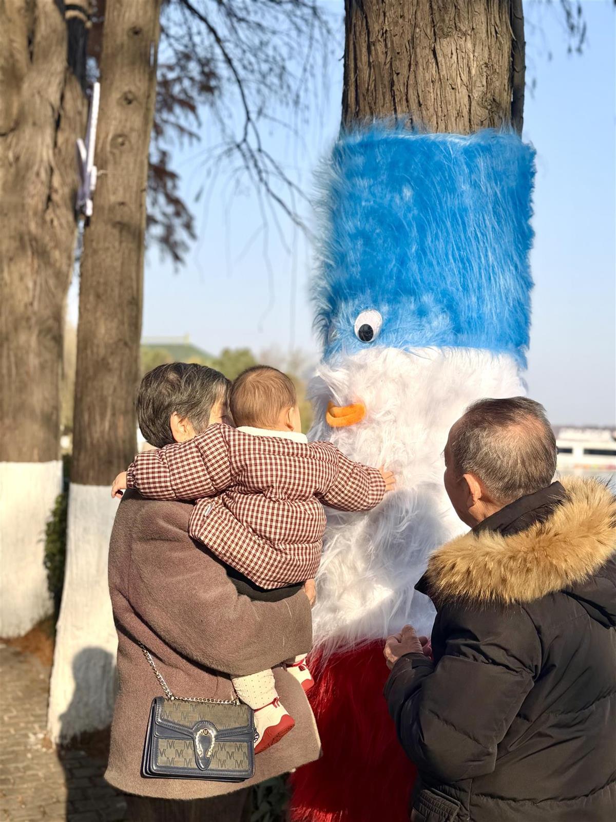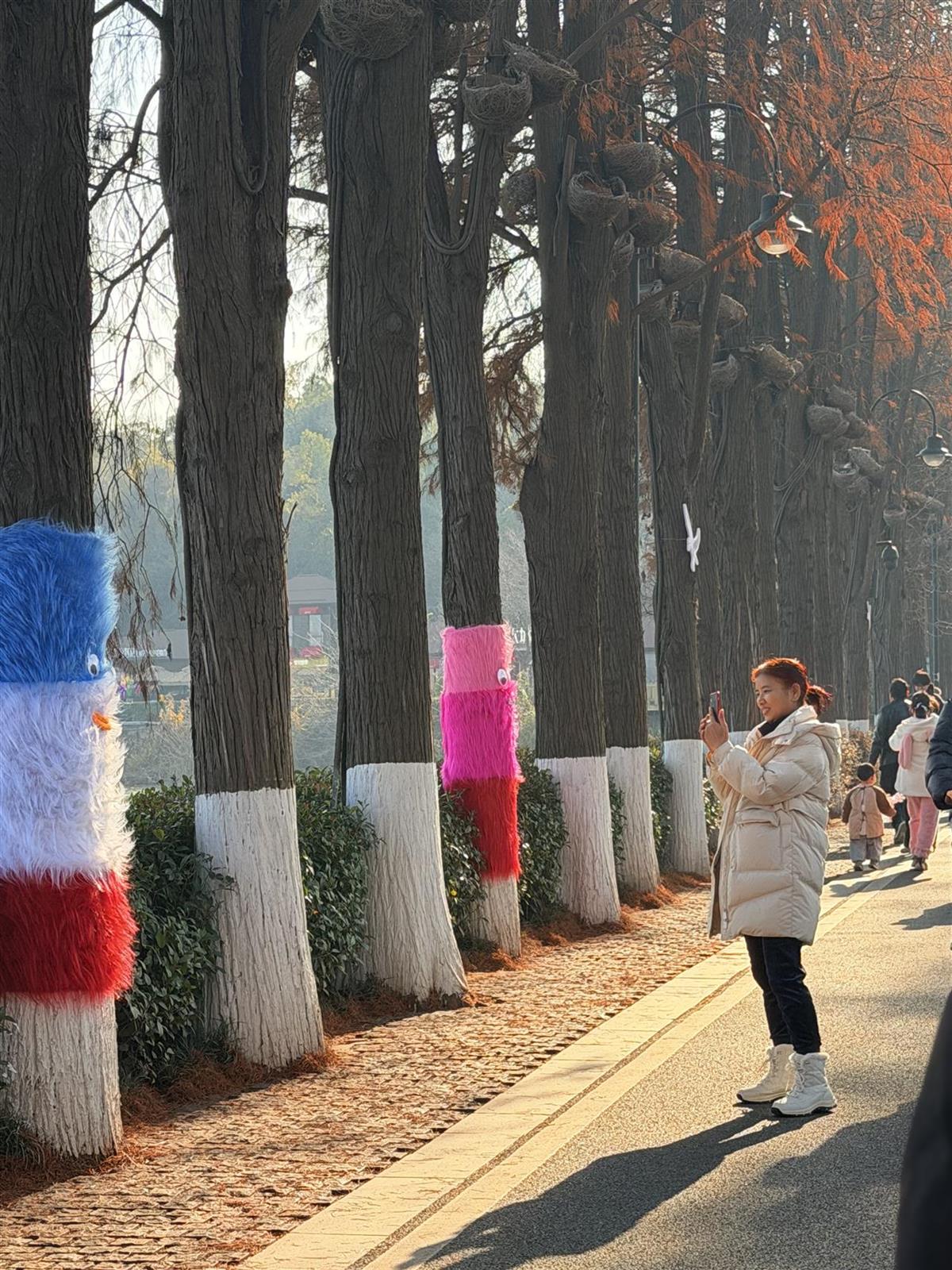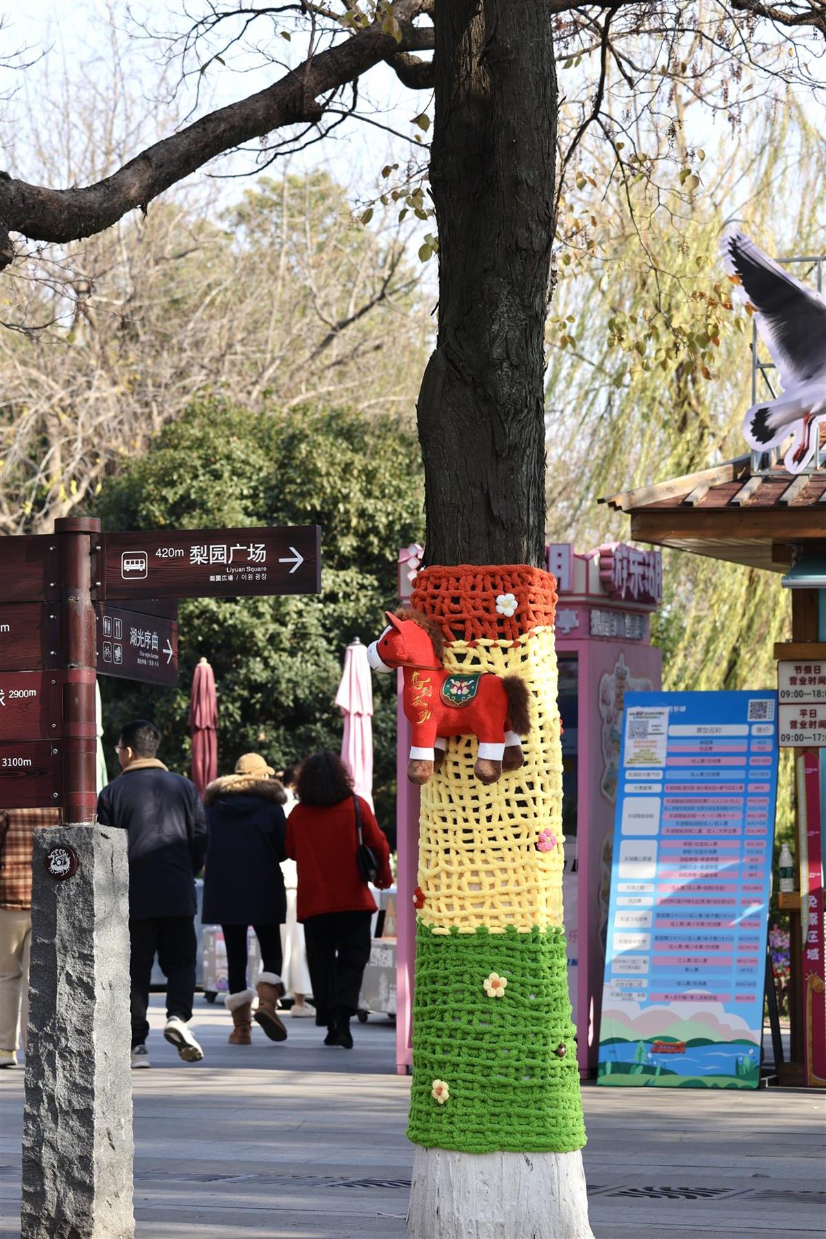 与此同时,备受喜爱的“大树穿毛衣”项目也温暖回归,且规模与创意全面升级。预计在春节前,将有约200棵树木穿上手工编织的彩色毛衣。今年的装饰融入了更多主题元素:从12月25日起,梨园入口处已有舞狮造型的树饰亮相迎宾;楚风园区域,寓意吉祥的马年元素也被织入毛衣之中。据东湖绿道项目经理孙诚介绍,去年冬季的“毛衣树”广受好评,今年因此特别采取“七分毛衣、三分彩绘”的组合策略,兼顾不同年龄段游客的审美偏好,让传统温暖与新颖创意共同点亮绿道。
