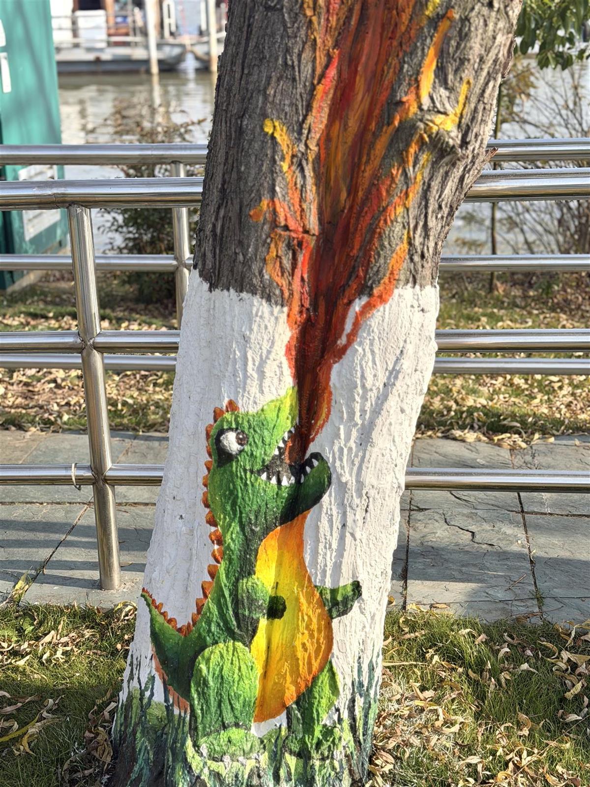 近日,武汉东湖绿道化身冬日创意画廊。树干上,恐龙仿佛在喷吐火焰,小猫从树洞好奇探脑;树木身上,五彩编织毛衣温暖裹身。这些生动景象,是东湖绿道为迎接元旦与春节,为200余棵树木换上的限定“彩衣”。