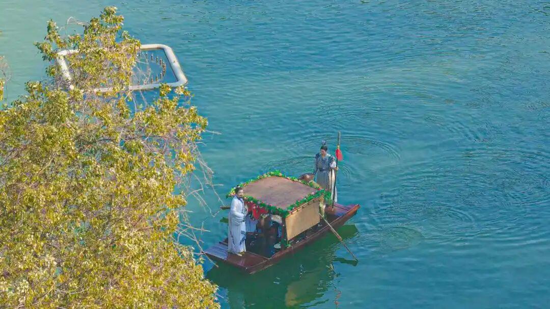 水榭廊桥畔,锣鼓声起,旌旗飘扬!一句句“欢迎贤士”暖意融融,瞬间将宾客带入沉浸式三国情境,开席仪式感直接拉满!湖面之上,薄雾氤氲间,羽扇纶巾的诸葛先生乘舟缓缓而来,船头红灯笼随风摇曳,与粼粼波光交相辉映。