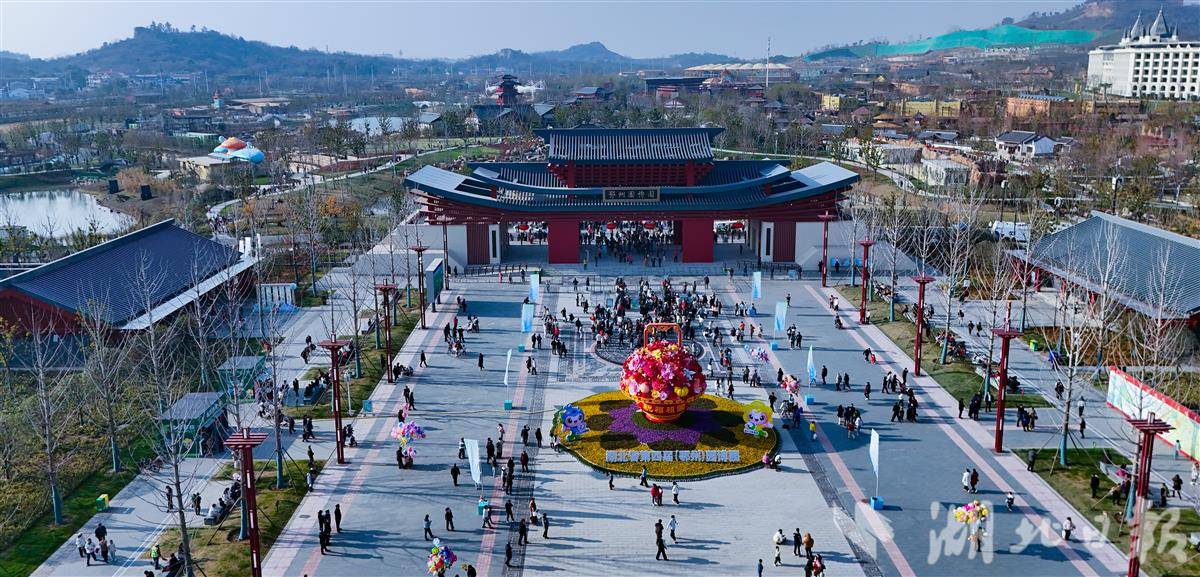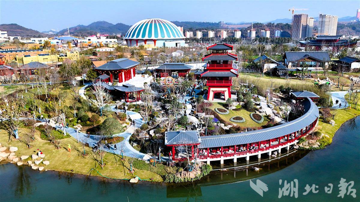 开园首日,从空中俯瞰,一块巨大的铜镜静卧于大门广场,晚清书法家张裕钊体的“鄂州园博园”题字古意盎然。园区整体呈三国风韵,山环水绕,亭台错落。咸宁园的刘家桥仿若原样搬来,孝感园里飘着桂花米酒汤圆的甜香,配着悠悠戏曲,甜醉了过往游客。非洲展区传来欢快的手鼓与舞蹈,赢得游客阵阵掌声与驻足。