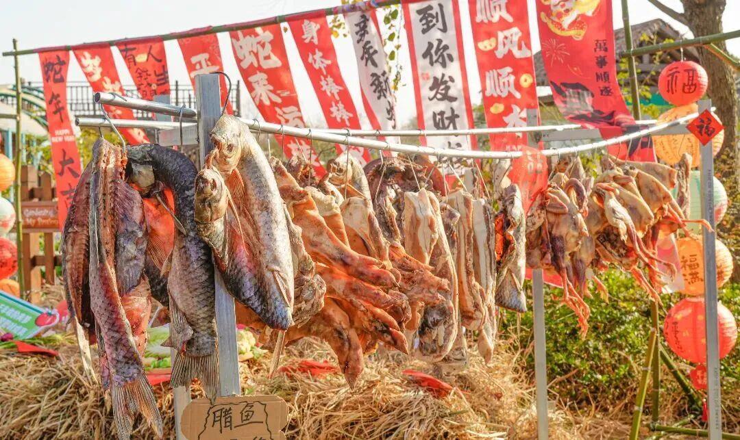 “藕遇蔡甸”非遗美食年货节同步开席,现做现吃的大集绿豆包子、藕圆子、蔡甸藕汤香气扑鼻,精心腌制的土猪腊肉、腊鱼等农家年货应有尽有,游客还可采摘新鲜草莓和蔬菜,把冬日鲜活滋味打包带回家。跨年夜更有万人齐放孔明灯活动,点点灯火承载新年祈愿,氛围感拉满。