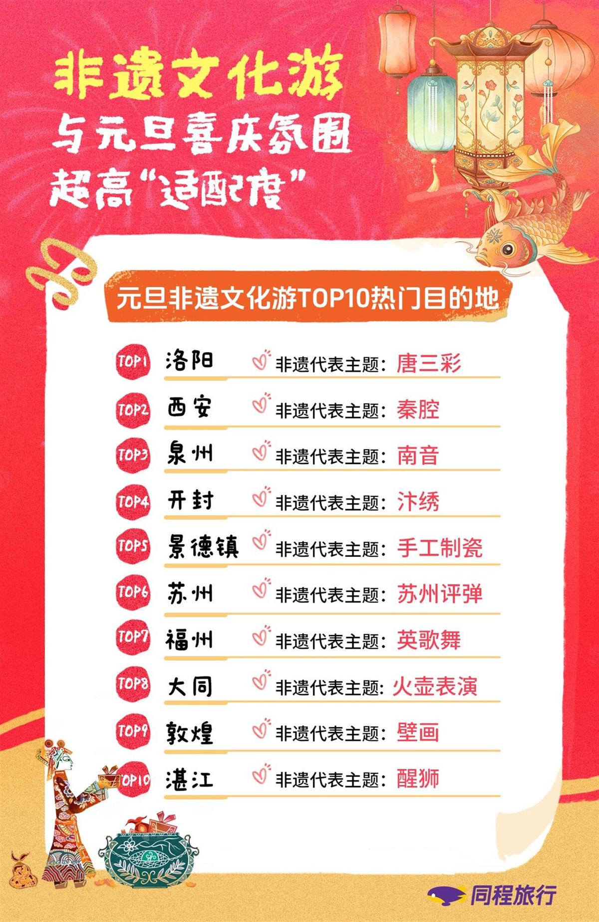 辞旧迎新之际,非遗文化游与热闹喜庆的元旦氛围适配度高。报告表明,元旦假期间,“非遗”主题旅游搜索及预订热度环比增长85%,洛阳、西安、泉州、开封、景德镇、苏州、福州、大同、敦煌、湛江等城市位居非遗文化目的地榜单TOP10。