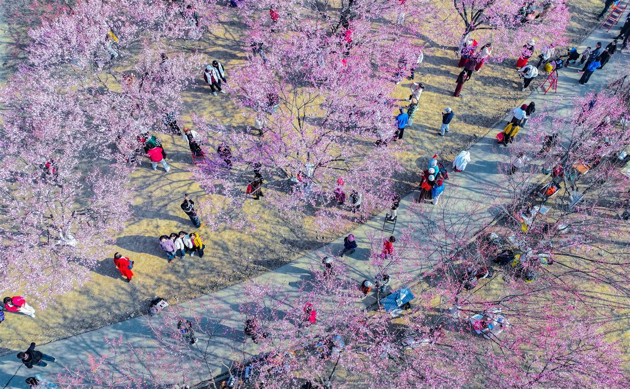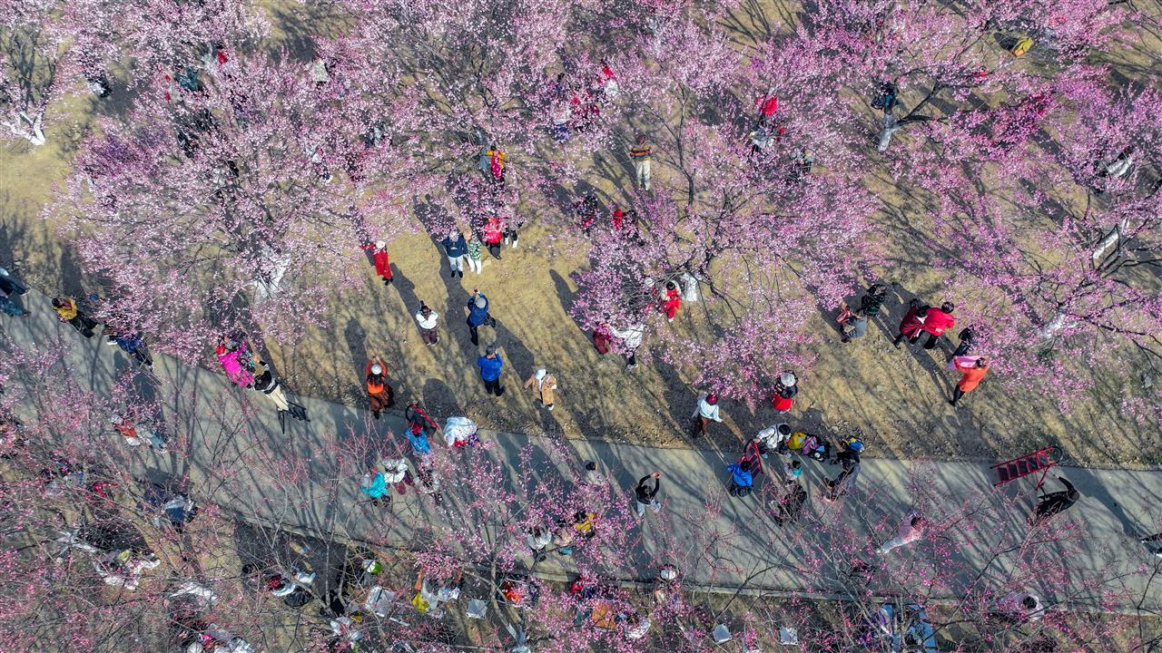 随着武汉近几日气温升高,江城不少地方梅花开放。其中位于武汉硚口区的竹叶海公园,梅花扎堆盛放,吸引了大批市民前来打卡、拍照。