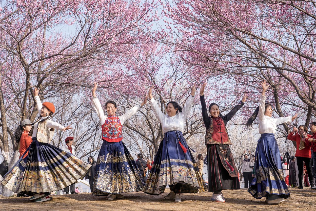 这群姐妹年龄跨度从50多岁到60多岁。她们虽不是同一期学员,却因共同的爱好走到一起,跟着网上的教程学习手舞,闲暇时最爱结伴寻访江城的花海。谈及去过的赏花地,大家你一言我一语地细数:武昌的沙湖公园是常去的打卡点,汉口江滩的梅花展也留下了她们的足迹。“走走逛逛,赏赏花,心情都变好了。”一位姓周的女士笑着说道,身旁的同伴纷纷点头附和。