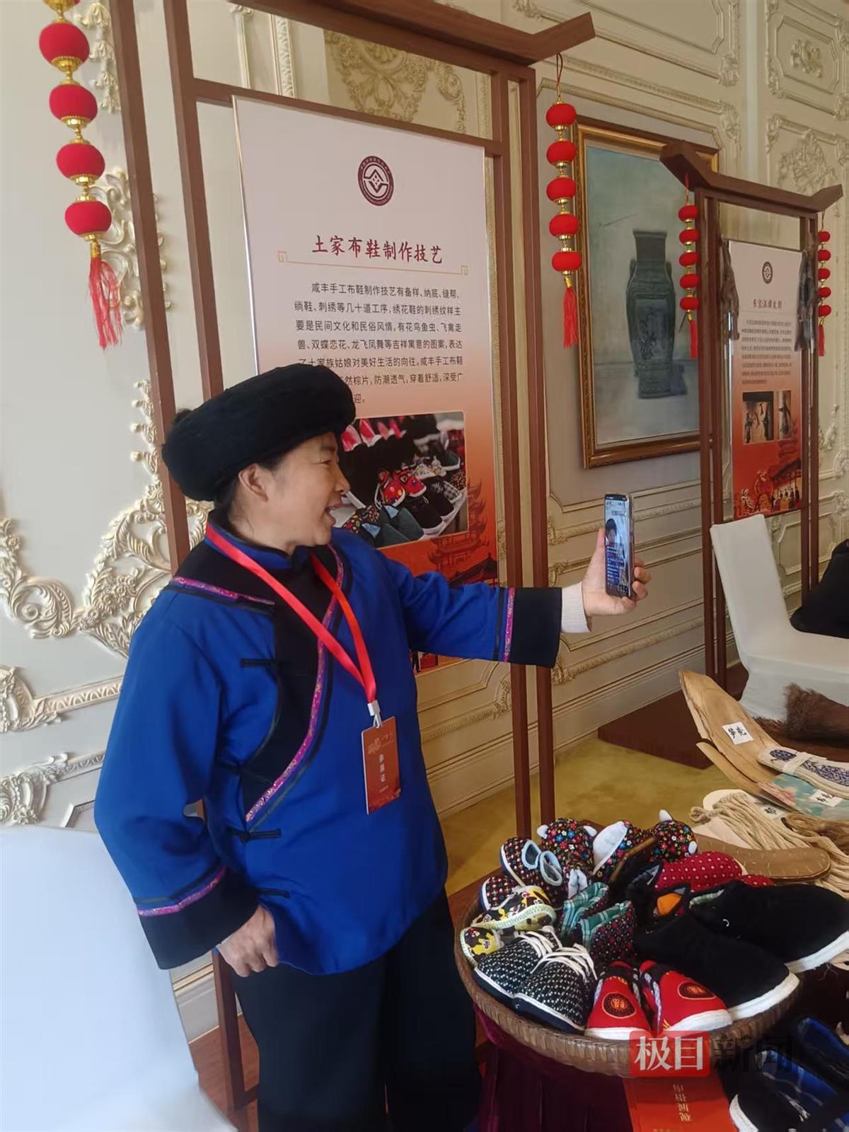 除了吃的喝的外,汉绣、香包、葫芦丝等非遗文创产品,同样吸引市民关注。17日当天,正好是土家布鞋传承人吴清香59岁生日,来自咸丰县大路坝乡的她,不仅在直播间里推介土家布鞋,还吆喝当地小南海、富尔溪等景区。