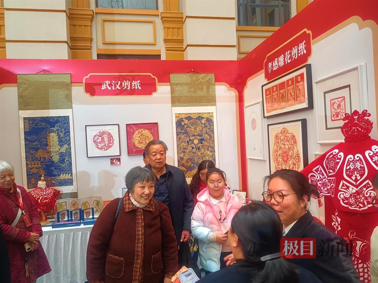 “剪艺新韵”展位里,武汉、鄂州、孝感三地剪纸同台竞秀。孝感雕花剪纸国家级非遗传承人池福新和他女儿、湖北省民间工艺美术家池泉,拿着作品向市民介绍孝感雕花剪纸的特色。一旁,鄂州雕花剪纸国家级传承人夏祖康也帮着介绍,同时也解释了鄂州剪纸跟孝感剪纸的渊源和异同。