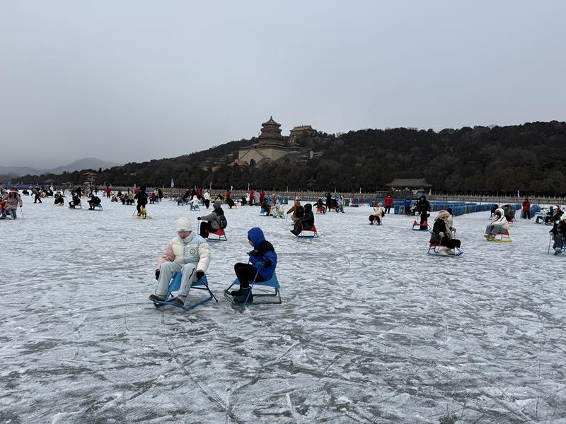 今年为何没有狗拉爬犁等电动设施了?颐和园经营科科长高悦告诉记者,往年冰场运营面积约35万平方米,但前段时间气温比较高,颐和园冰冻的面积不是非常大,所以今年冰场没有划分电动设备区域,整体运营面积缩减了一半,约为16万平方米。但大家的兴致还是很高,冰场游客自发连成长龙。“一个自行车在前面,后边拉着很多冰车,我们也问了一下,大家其实都不认识,但是想用这种游乐方式活跃气氛,通过冰场进行社交。”