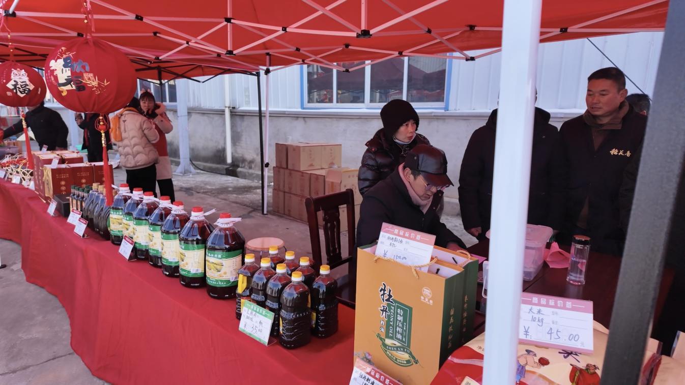 现场分区清晰,货品丰富多元。肉类专区供应新鲜宰杀的猪、牛、羊、鸡及各类卤味干货;农产品区汇集了朱桥香米、麻油、土鸡蛋等地道农产,其中安陆市王义贞镇文健食品有限公司的松花皮蛋、湖北长生堂高新农业有限责任公司的长生米等本地品牌产品备受关注;牡丹主题区则展出牡丹酒、牡丹花蕊茶等特色商品,彰显本地产业特色。
