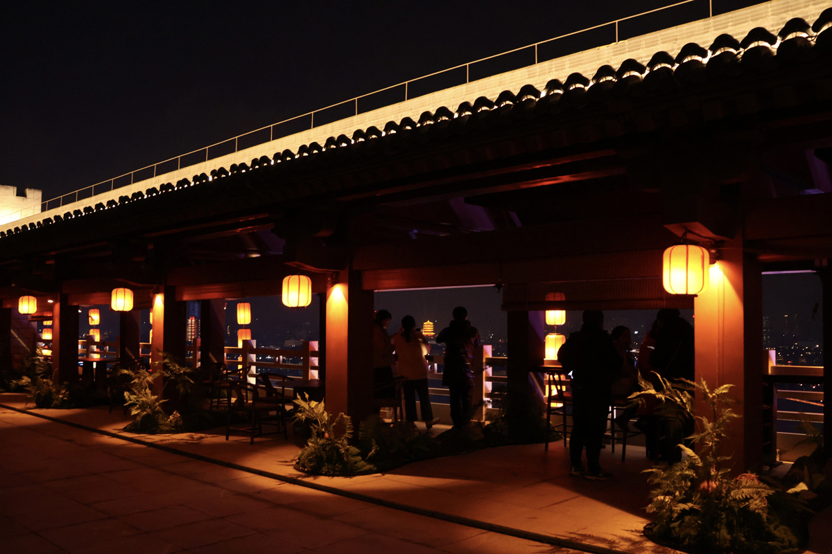 知音殿以“茶、艺、养、团、商”五大业态为支撑,构建集观景、文化体验、休闲社交于一体的复合空间。目前,二层茶咖区已率先开放,将传统茶文化与现代咖啡创意相结合,推出“围炉煮茶+高空观景”特色体验。游客可围坐暖炉旁,品茶饮咖,搭配烤红薯、橘子等暖食,静赏江上行船与都市繁华,在市中心享受山水意境与城市风光交融的独特氛围。