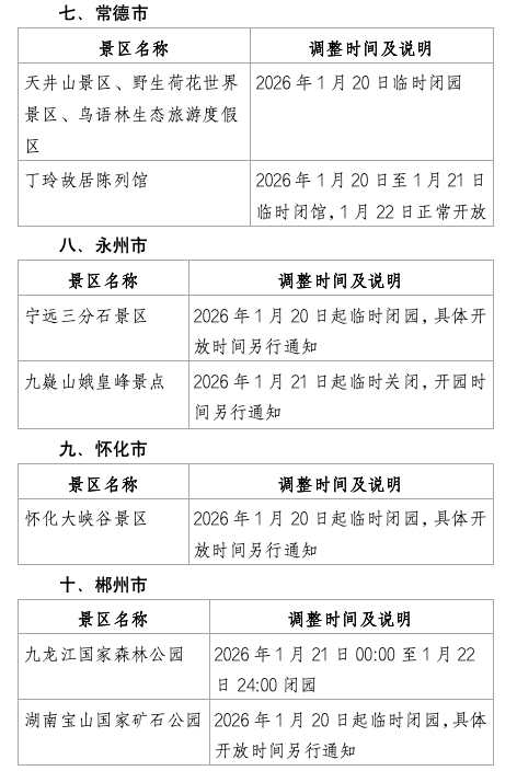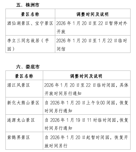 红网时刻新闻1月21日讯(记者 何超 实习生 叶沁铃)受持续低温雨雪冰冻天气影响,为确保游客安全,湖南省内多地景区近日陆续发布临时闭园通知。截至1月21日,湖南多个市州的部分景区已采取闭园或调整开放时间措施。一些景区预计将于1月22日至23日前后逐步恢复开放,具体时间请游客密切关注景区官方通知。提醒广大游客合理安排行程,注意出行安全。