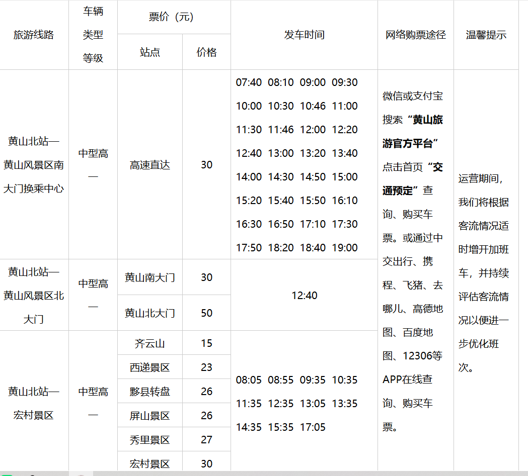 运营期间,我们将根据客流情况适时增开加班车,并持续评估客流情况以便进一步优化班次。您可通过支付宝或微信搜索“黄山旅游官方平台”点击首页“交通预定”在线查询、购买车票。感谢您的理解与支持,不便之处敬请谅解。咨询电话:0559-2358999。
