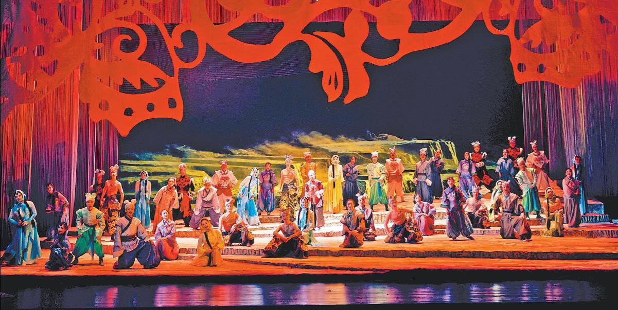 陕北民歌剧《歌从陕北来》以老年玲儿的窑洞追忆为主线,用一纸窗花剪开半世时光,徐徐展开一幅交织着爱情、信义与坚守的黄土画卷。正月秧歌场上,17岁的玲儿递出的一只荷包,牵起她与赶牲灵的双喜、守乡土的五哥之间绵延半生的情感羁绊。双喜为爱远行却不幸殒命,五哥则以沉默的牺牲接续起生命的诺言。故事从正月秧歌的热烈、三月桃花的萌动,走向六月烈日的焦灼、九月秋风的苍凉,在四季轮回中,不仅刻画出人物命运的跌宕,更深刻诠释了陕北人“把苦唱成盼,把死唱成生”的精神品格,唱响了关于爱情、命运与乡土的永恒咏叹。