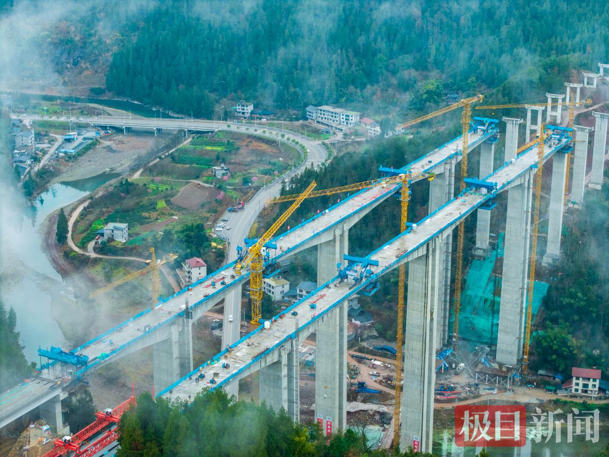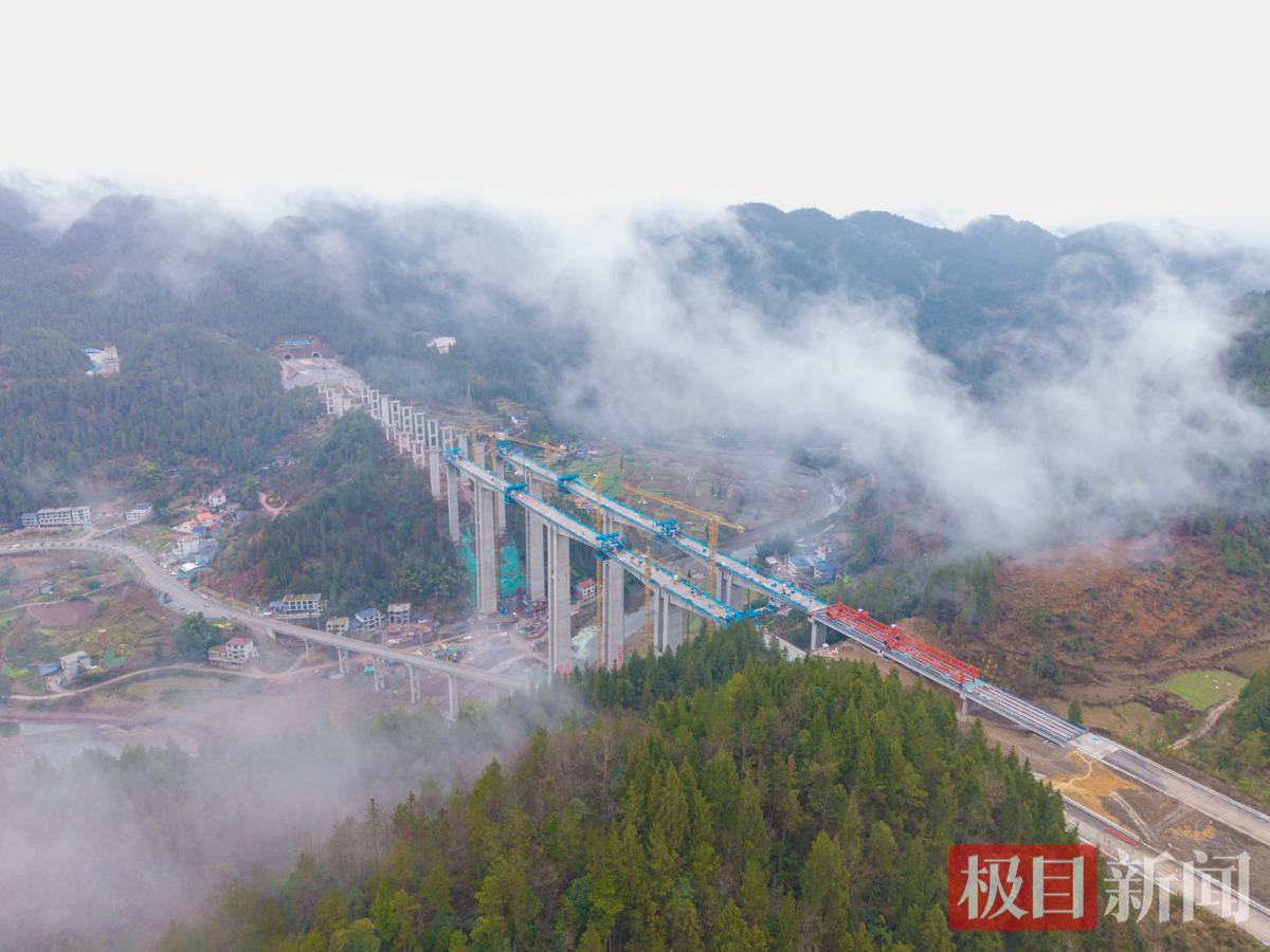 黄河坝特大桥位于湖北恩施咸丰县唐岩镇南河村,全长1018米。作为利咸高速“三桥三隧”控制性工程中首座实现双幅贯通的连续刚构特大桥,此次合龙标志着项目特殊结构桥梁施工取得关键性突破,为全线建成通车奠定了坚实基础。