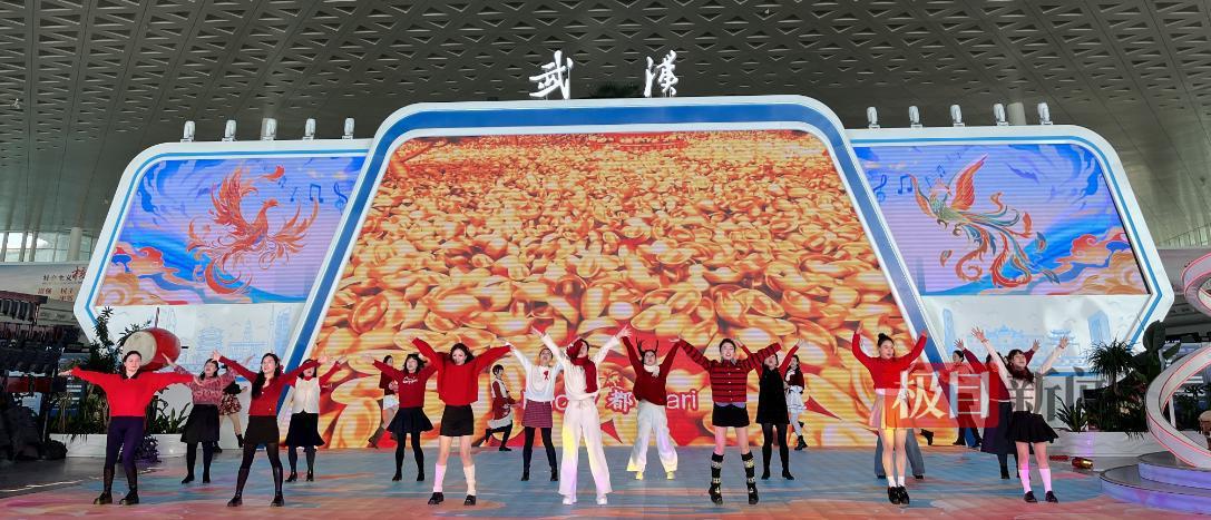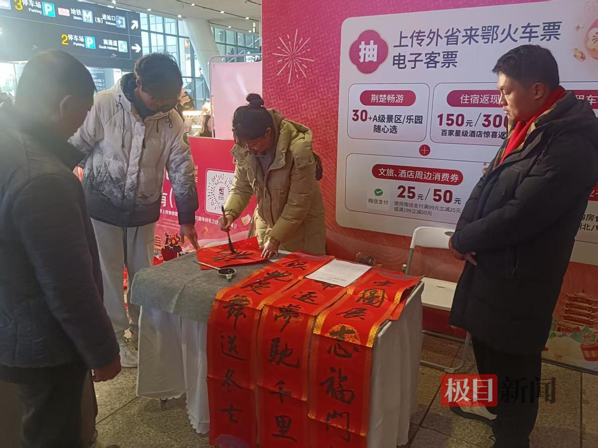 2月2日下午,在武汉火车站举行了启动仪式。启动仪式外围,非遗糖塑、春联书写等摊位吸引了不少游客关注。从广东中山来湖北游玩了一周的周淑贤,返程时在武汉火车站看到有活动,就请黄陂糖塑非遗传承人朱红彦吹了一匹马的糖塑。武昌工学院书法专业大四学生庄歆越从南昌的家里返校办事,在车站遇到中国书法家协会会员张助刚给游客写对联、福字,就主动上前当助手,帮忙张助刚拖纸、上墨,后来忍不住技痒,干脆要过红纸,写了一副对联,被一位游客“抢”走。