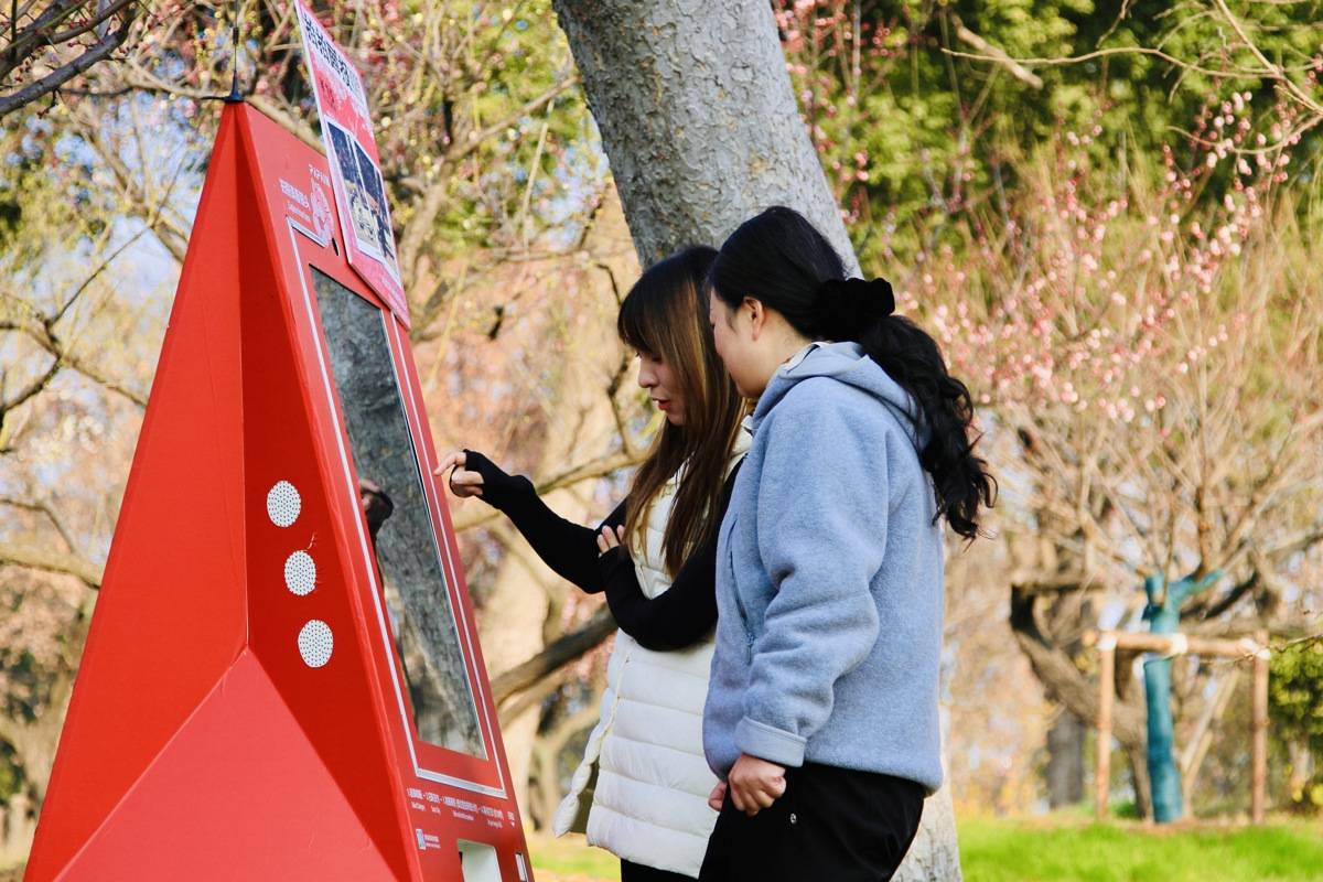 观梅台下承载四十余载记忆的石椅旁,联合支付宝设置AI相机;游客可选用“1983年复古场景滤镜”拍摄,照片打印将自动加载“东湖梅展1983-2026”专属相框,沉浸式穿越回第一届梅花展。