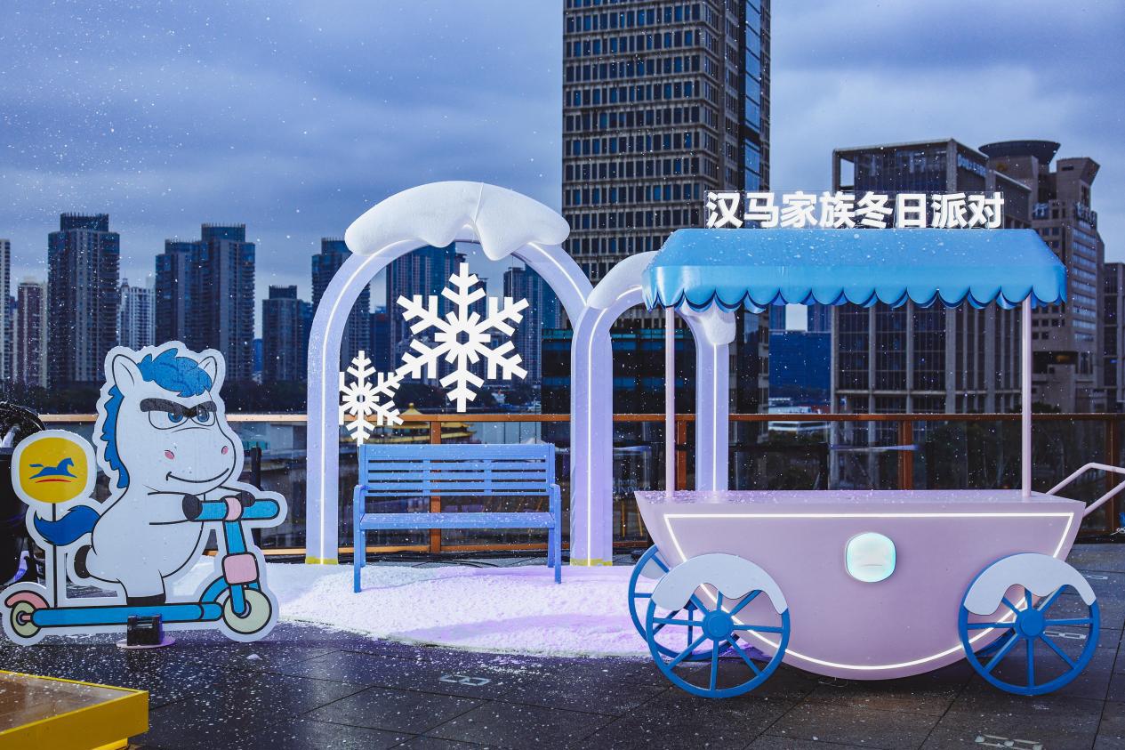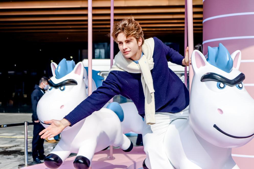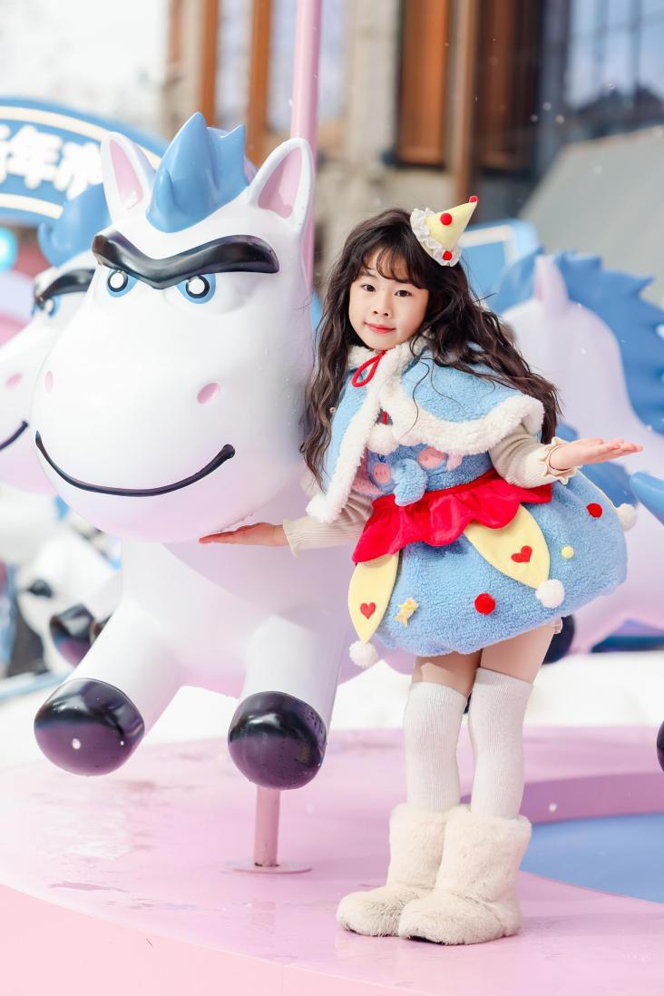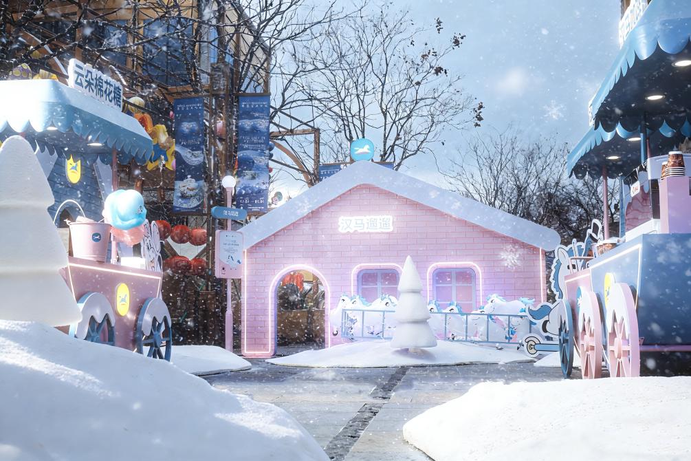 蓝粉交织的冬日市集、缓缓旋转的旋转木马、瑞雪落在嘉宾肩头。来宾拿着甜甜的云朵棉花糖,吃着小马冰棍,在童话般的氛围里穿梭。