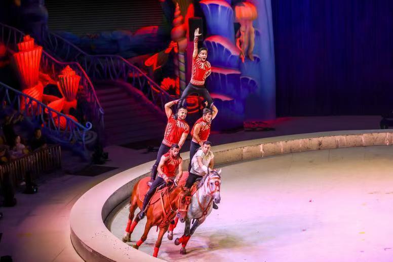 极地大马戏场馆内,“马上有戏”主题布置亮眼夺目。魔术杂技、优雅马术、环球飞车、生死魔轮等世界级表演的道具全部就位,记者现场观看了片段试演,惊险与趣味并存的呈现方式,必将让游客大饱眼福。
