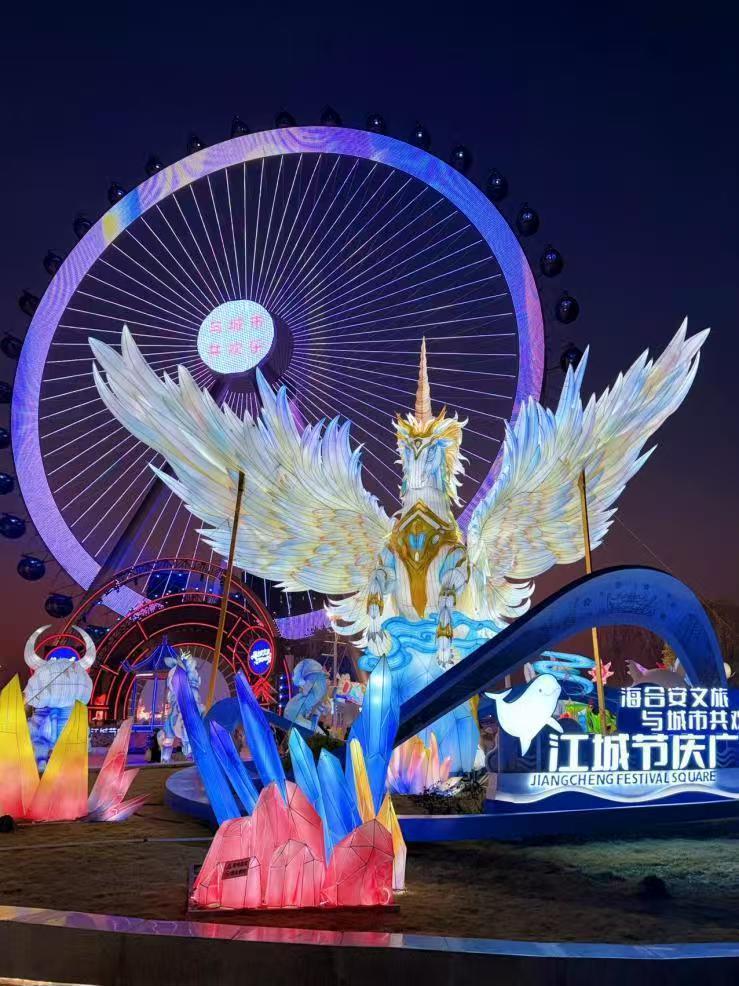 度假区推出多重全民免费福利,让游客轻松解锁新春潮玩体验。春节期间,91米高的“楚天之眼”摩天轮全民免费开放,记者看到不少游客登上摩天轮,俯瞰江城绝美夜景,定格璀璨灯光秀的浪漫瞬间。华中首创的非遗海洋花灯同样免费观赏,10米银翼飞马霸气亮相,瑞兽灯阁、十二生肖赛博山海、怪咖丛林三大主题区光影交织、流光溢彩,随手一拍都是新春限定大片,吸引了许多游客拍照留念。