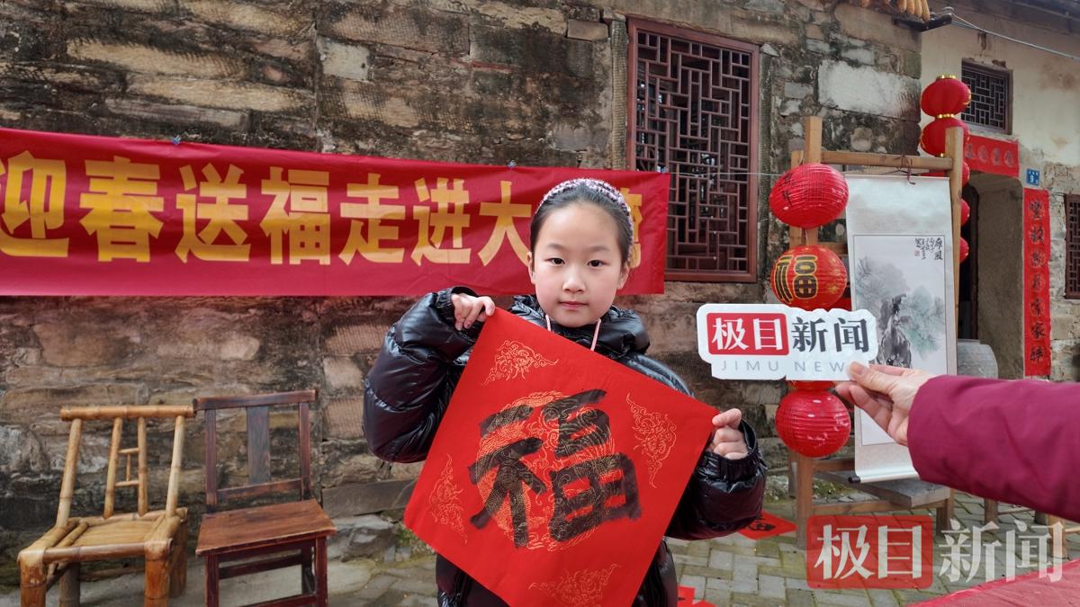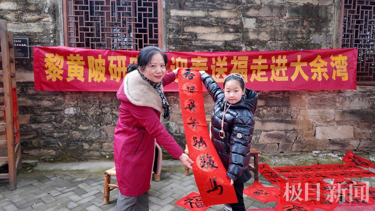 大余湾对联馆前,偶遇黎黄陂研究会书画老师们写春联送福,游客排队领取。游客李沐希接过老师手中的春联,并为老师送上了满满的春节祝福。