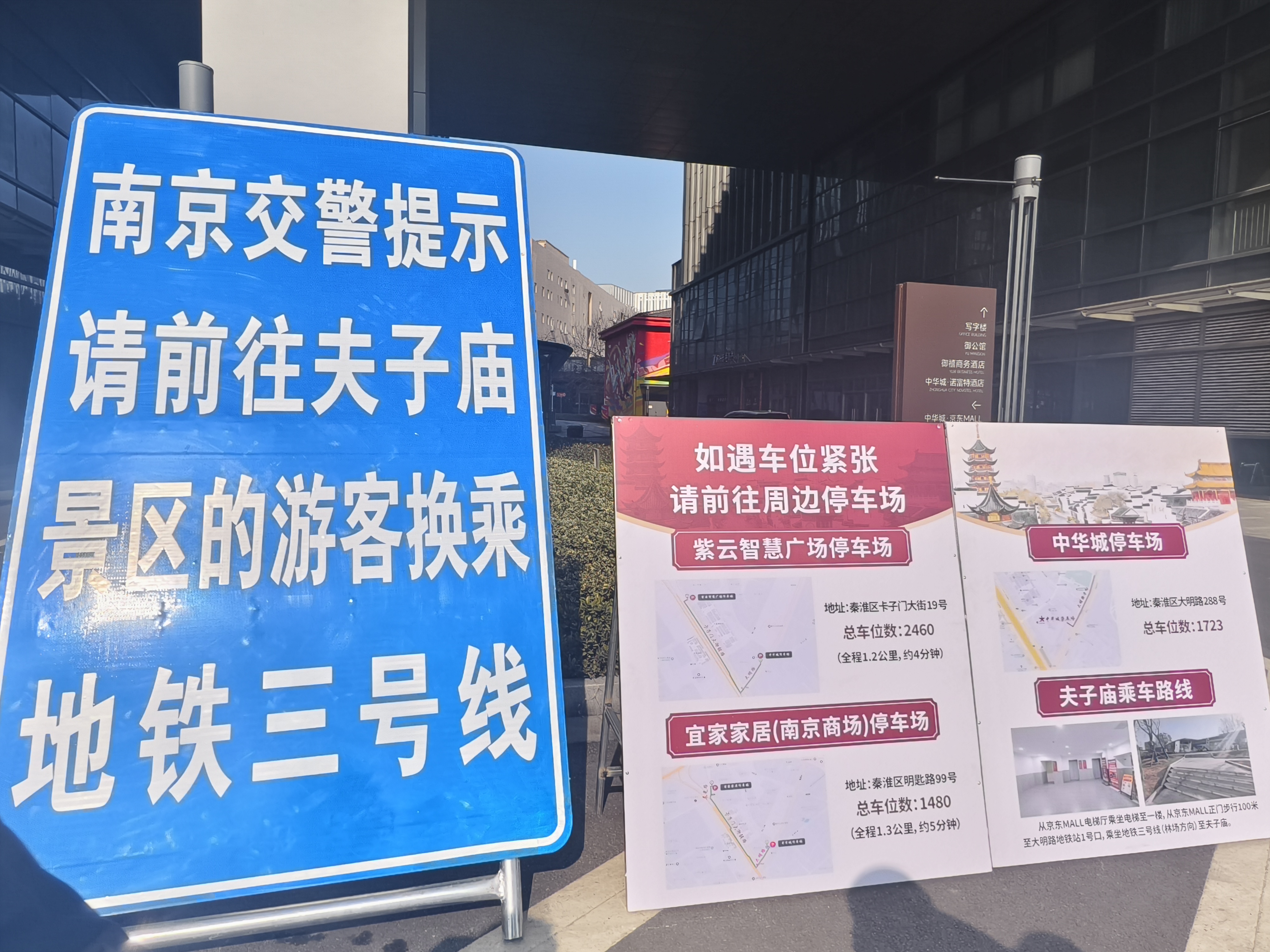 当天上午,现代快报记者先是驾车来到了位于大明路附近的中华城停车场。记者在停车场出入口看到,醒目的交通指示牌一目了然,不仅清晰标注前往夫子庙景区的路径,还详细公示周边停车场泊位数量,让自驾游客提前规划、安心停放。