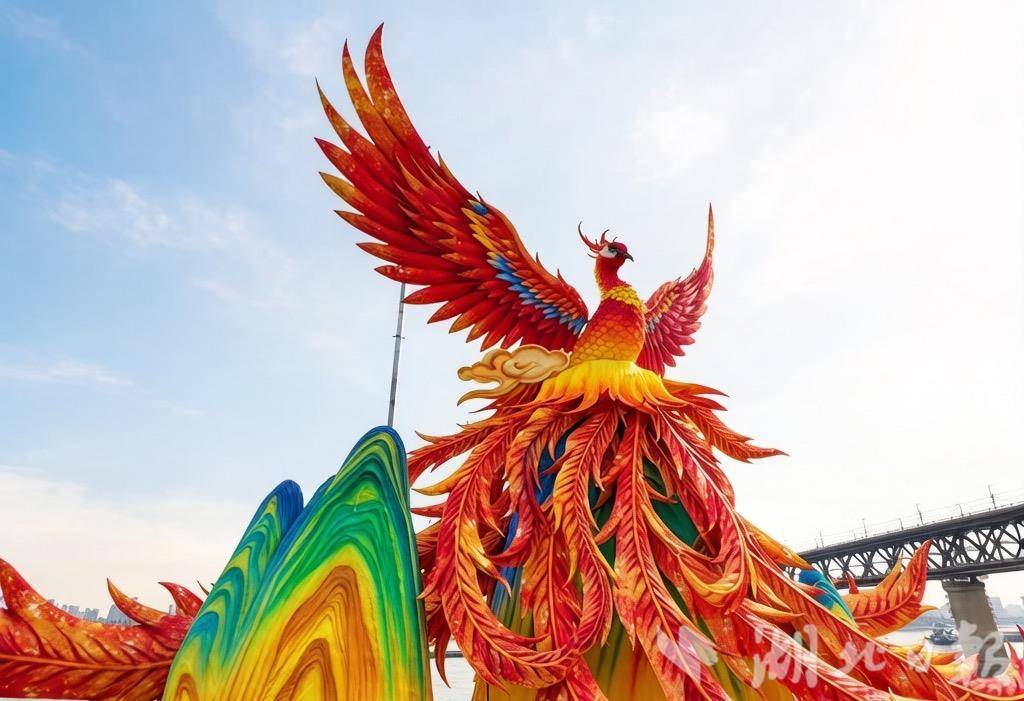 汉阳江滩,武汉首届晴川灯会开放,13.5米高的火凤凰花灯,与矗立于江边的晴川阁交相辉映。