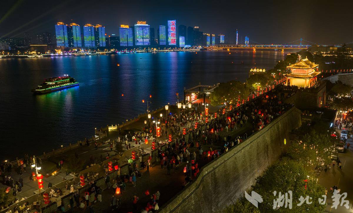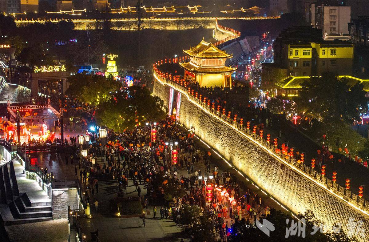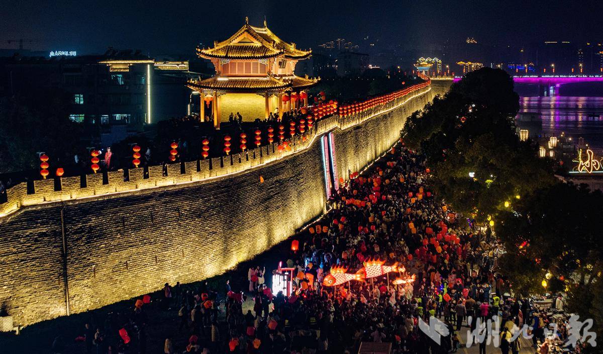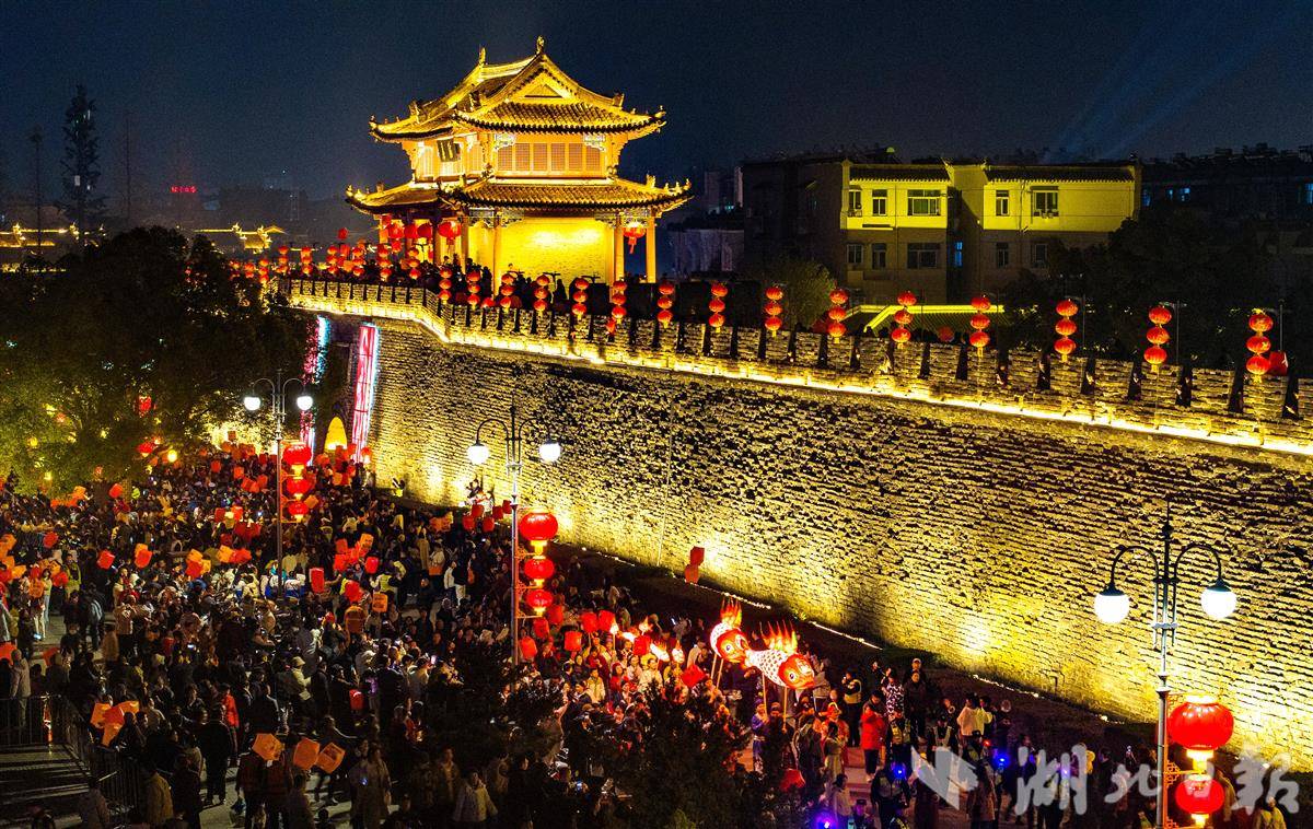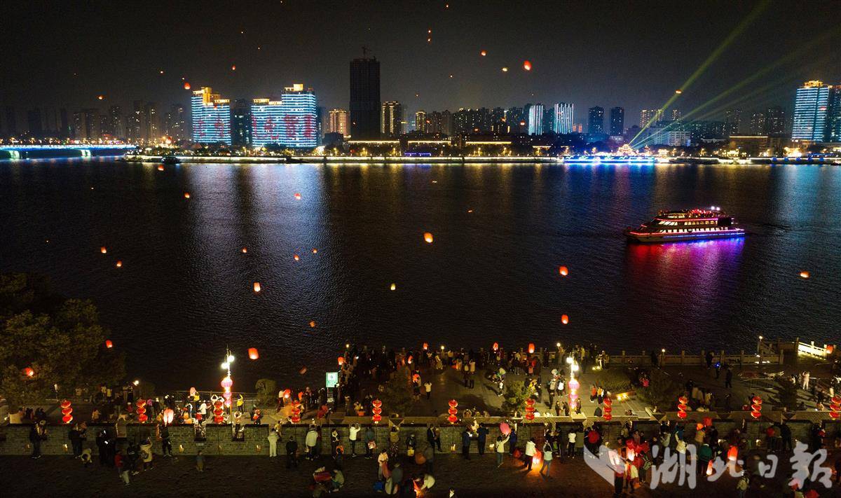 2月14日晚,襄阳市民和游客观民俗表演,放飞孔明灯,迎接新春佳节到来。当晚,襄阳古城小北门广场上演“千灯临汉万户迎春”活动,古城墙巍峨矗立,昭明台华灯初上,汉江之上流光溢彩,一盏盏孔明灯次第升空、翩跹起舞,将千年襄阳的夜空点亮,满城喜气漫卷汉江两岸。(视界网王虎摄)