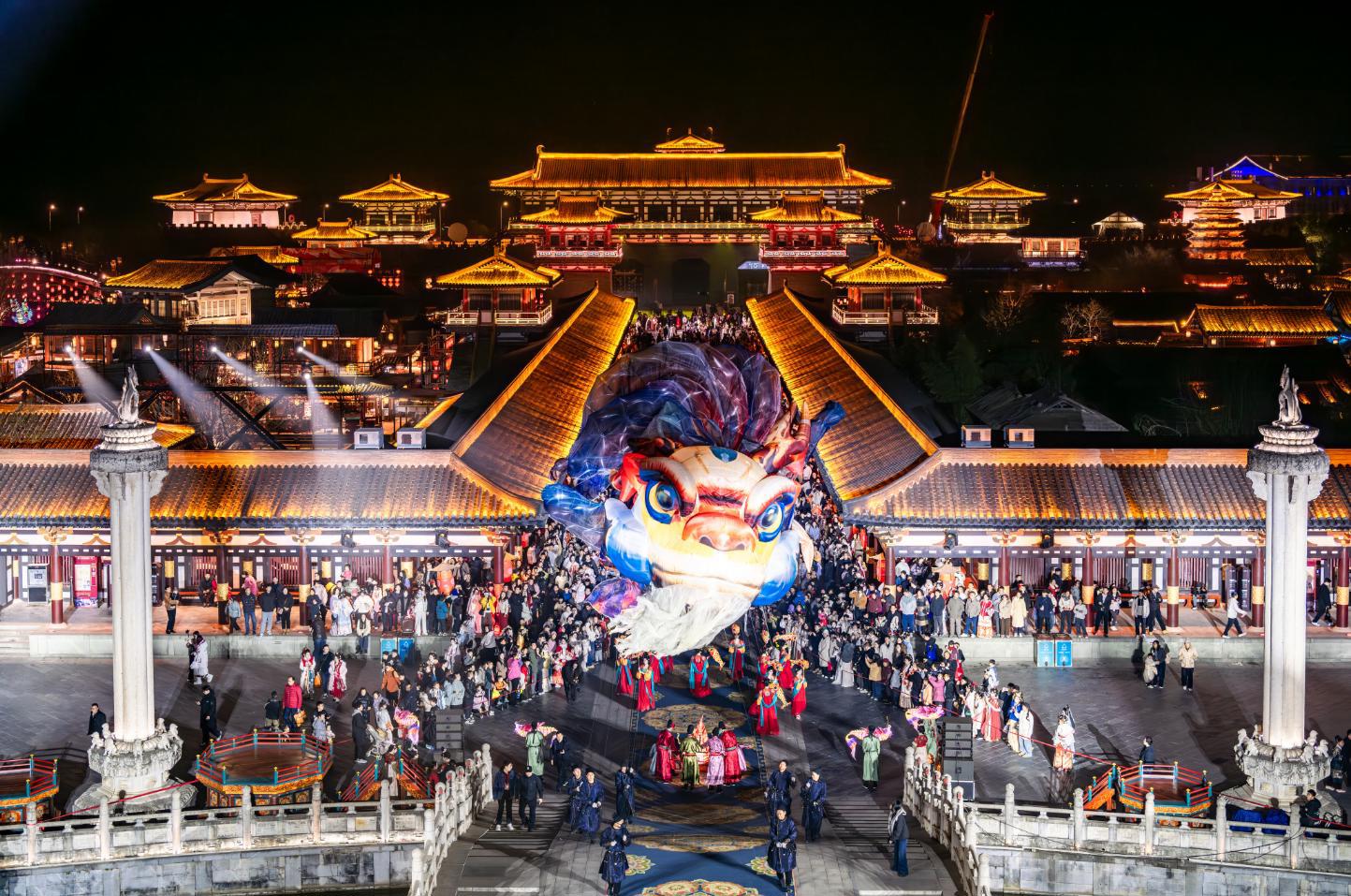 盛世唐城景区以“红火唐城·马到成功”为主题,一踏入城门,仿若一幅千年前的盛唐画卷徐徐展开。巨型鳌鱼灯摆动着飘逸的鱼尾在街巷中央游弋,演员踏着古朴的步伐翩翩起舞,传递着新春纳福的美好寓意。唐风演艺嵌入街巷每一个角落,大唐Live秀的歌声嘹亮动人,NPC身着华丽唐装,随时与游客擦肩互动,入夜后,璀璨烟花划破夜空,非遗打铁花、火龙钢花同台“炸场”,星火漫天飞舞,与仿唐建筑交相辉映,还原出“火树银花不夜天”的盛唐江湖热闹图景,现场欢呼声、惊叹声此起彼伏。