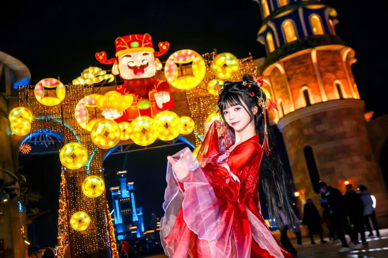 襄阳华侨城奇幻度假区的奇幻灯会持续点亮,45万方自贡非遗灯组将园区装点成不夜城,光影璀璨间尽显国潮魅力。襄城管家巷的青瓦白墙间,挂满了马年主题的剪纸和灯笼,身着古装的NPC手持“侠义令”,引导游客解谜答题、领取“功名帖”。