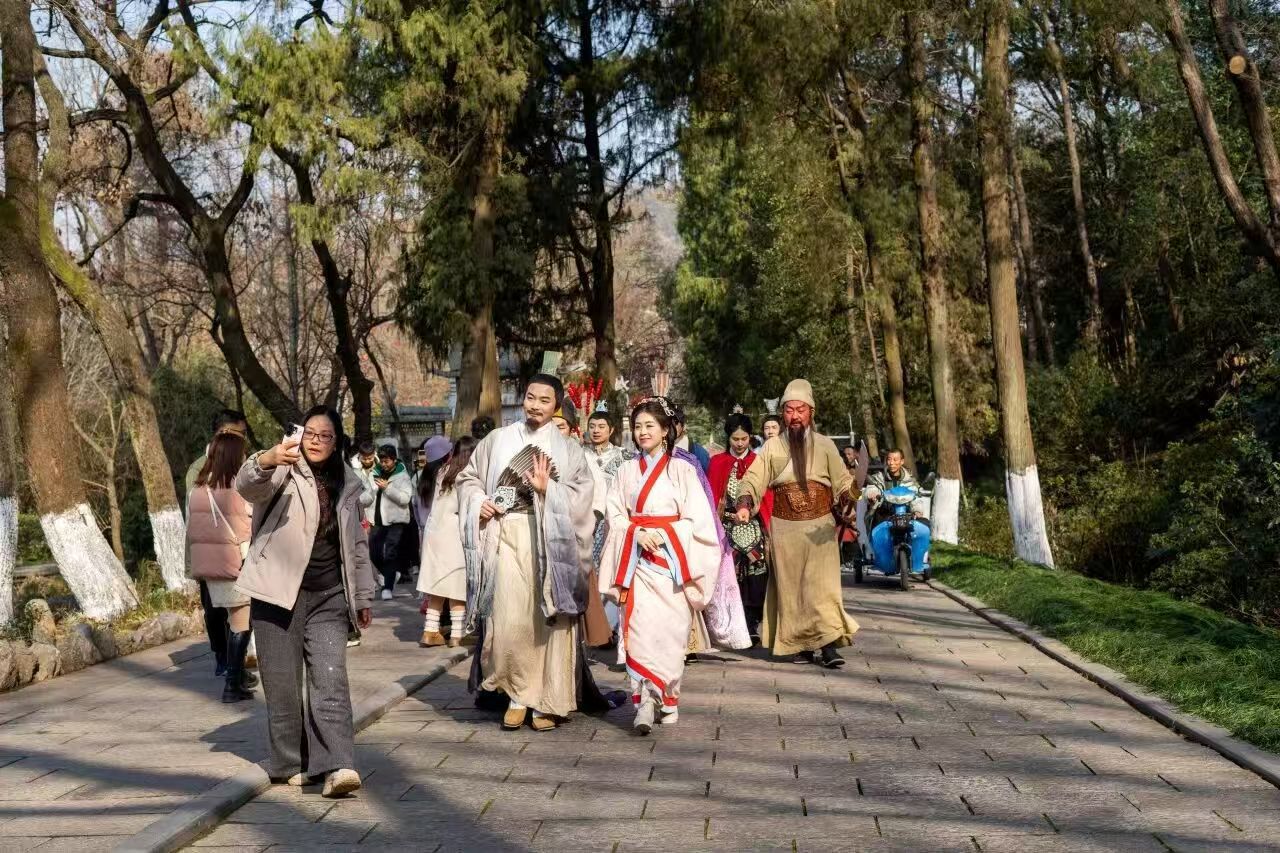 在核心景区,实景剧游与国潮演艺轮番上演,现场人气爆棚、暖意融融。古隆中景区“遇见诸葛亮·借东风过大年”实景剧情游火热开启,“诸葛亮”“黄月英”“张飞”步态从容地穿梭在亭台楼阁间,时不时与身边游客拱手互动、出题闯关。非遗手作摊位前,艺人手法娴熟地编织着中国结,美食市集上飘来阵阵香气,马年祈福装置前,游客们有序排队,双手合十许下新年心愿,红绸系满枝头,氛围感拉满。