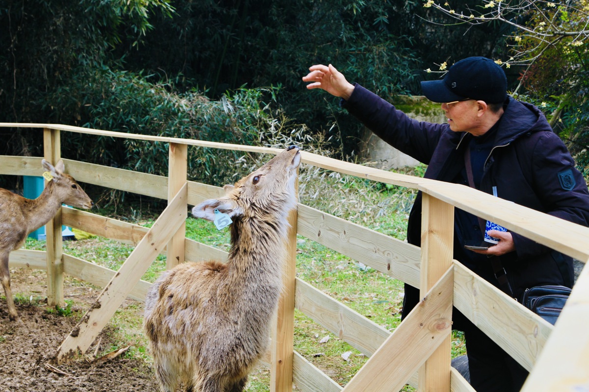 梅树下,温顺梅花鹿悠闲踱步,成为园内治愈风景线,游人轻声互动、合影留念,在梅香氤氲中许下新年美好心愿。