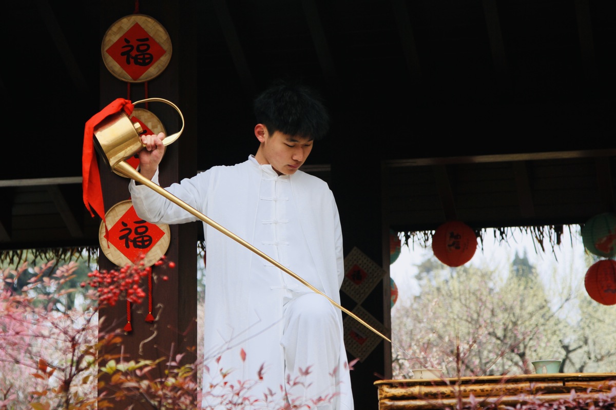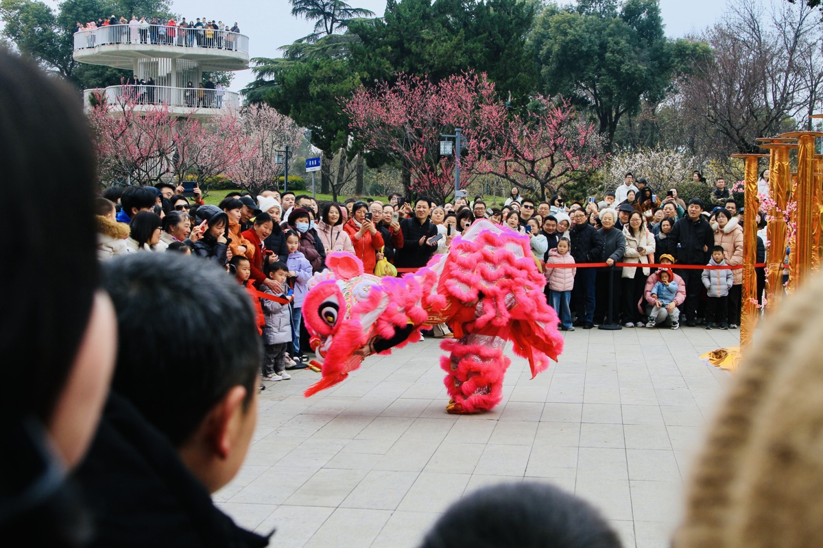 为丰富游园体验,梅园精心打造多项新春特色活动:影壁前舞狮铿锵腾跃,祈福迎新;冷艳亭内琵琶婉转,乐韵伴梅香;“梅妻鹤子”景点长嘴壶茶艺尽显非遗魅力。“舞蹈送福+糖果传甜”快闪温馨有趣,“梅韵非遗市集”好物琳琅,楚绣、米酒、梅香文创等深受游客喜爱。