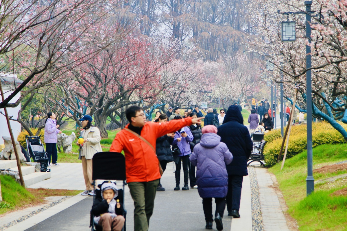 新春伊始,梅园迎来最佳赏花期。园内两万余株、三百六十余种梅花竞相吐蕊,粉若丹霞、白似凝雪、红如烈焰,变绿萼、台阁宫粉等名贵品种风姿卓绝。梅香幽幽、沁人心脾,身着汉服的游客梅下留影,阖家出游的市民漫步赏梅,尽享团圆温馨时光。