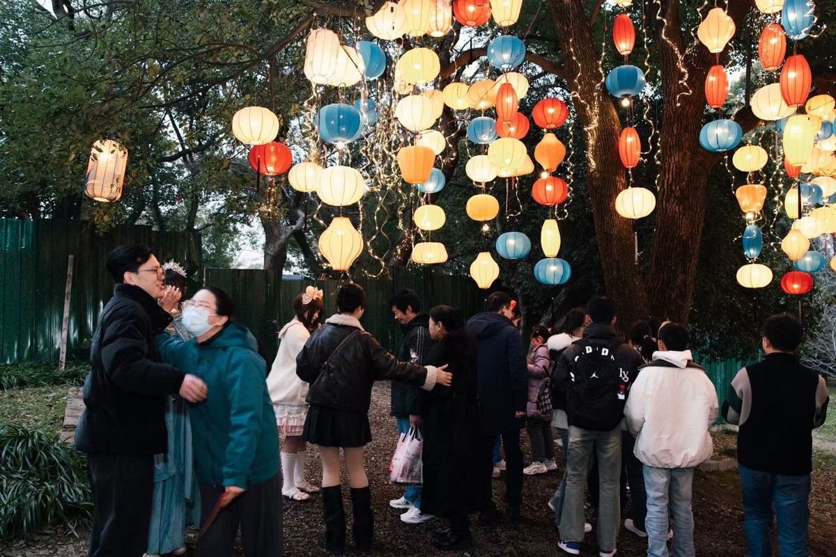 夜幕降临,华灯初上,东湖牡丹园迎来一天中最璀璨的时刻。自贡非遗彩灯与现代光影科技碰撞出奇妙火花,30多组灯组同步点亮,流光溢彩、如梦似幻。沉浸式灯光秀轮番上演,灯光倒映在湖面,渔火映千灯,波光伴灯影,勾勒出一幅绝美的东湖夜景图。“渔火映千灯、鳌山耀盛世”两大打卡点前,游客们有序排队,摆出各种姿势拍照,手机闪光灯与灯组光影交相辉映,成为园区里最热闹的风景。国潮电音响起,身着汉服的年轻人伴着旋律尽情舞动,汉服蹦迪、蒜鸟音乐会轮番登场,传统与潮流碰撞,古老的园区焕发着青春活力,不少游客跟着旋律哼唱、摇摆,将新春的喜悦尽情释放。