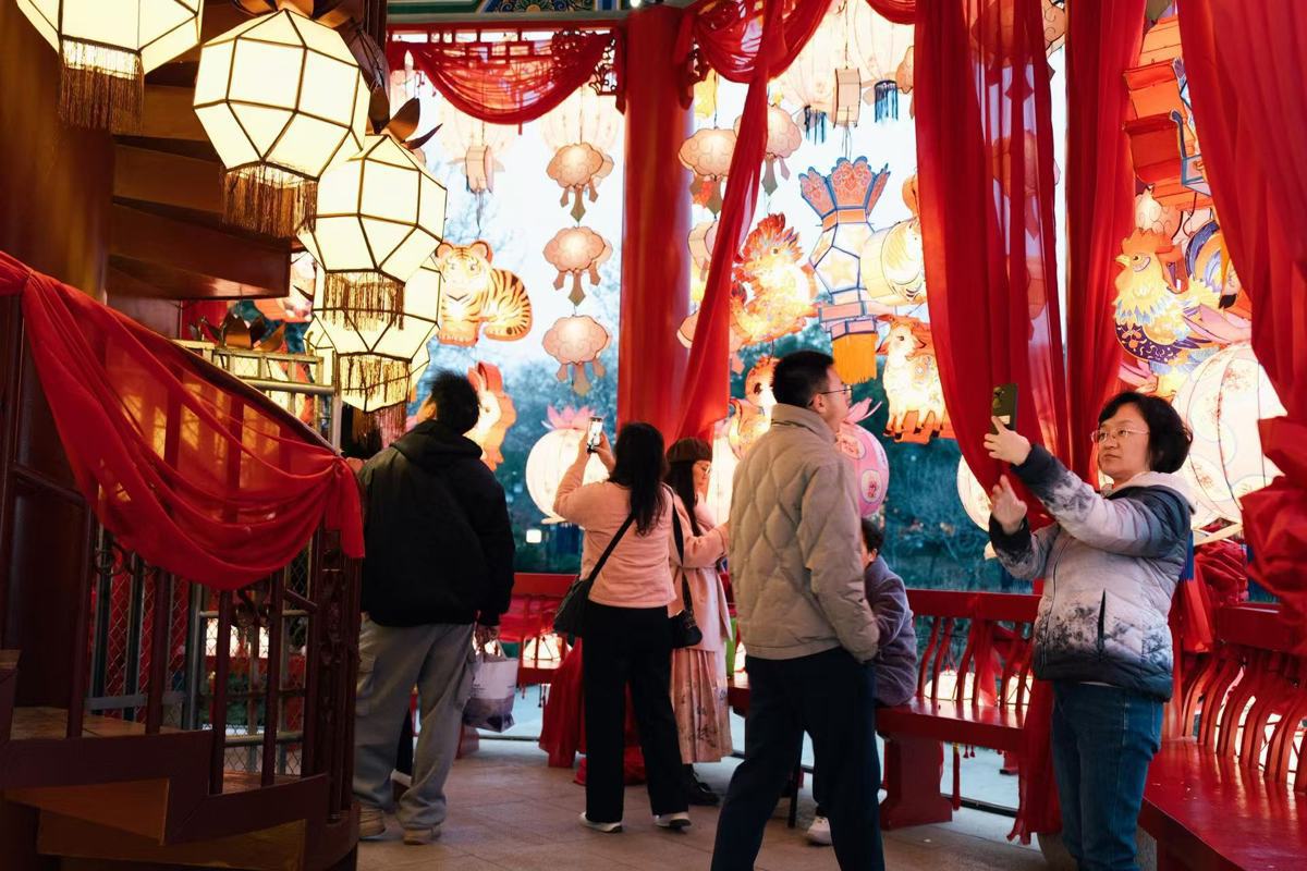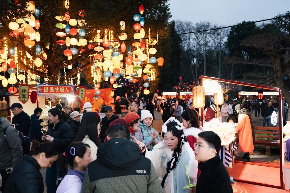 据介绍,游园会精心打造“日赏+夜游”双模式,让游客从晨光微熹到暮色四合,都能收获满满乐趣。白天的园区,热闹非凡、烟火气十足,“抓马”大巡游踏着欢快的节奏登场,身着国潮服饰的演员们载歌载舞,舞狮、民俗杂耍轮番上演,锣鼓声、欢笑声此起彼伏;国潮NPC随机现身,“容嬷嬷”大战“白娘子”,“唐僧”放下紧箍咒,“包租婆”向“至尊宝”租借月光宝盒,各种CP打破次元壁在此相遇;主题市集上,糖画、面人等非遗技艺轮番亮相,汉味小吃香气四溢,文创好物琳琅满目,不少游客驻足挑选,感受市井烟火里的新春暖意;投壶、猜灯谜等年俗游戏前,大人小孩排起长队,沉浸式体验传统年俗的乐趣,一张张笑脸定格新春美好。