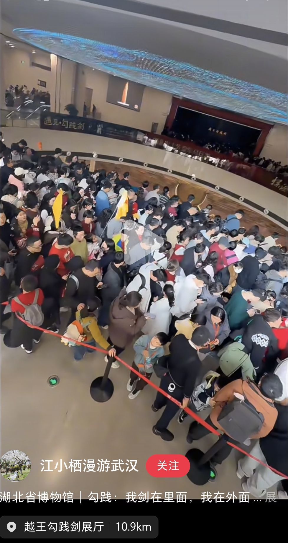 一位“江小栖漫游武汉”的博主分享了春节期间馆内排队人群摩肩接踵的画面,配文说“勾践:我剑在里面,我在外面”。