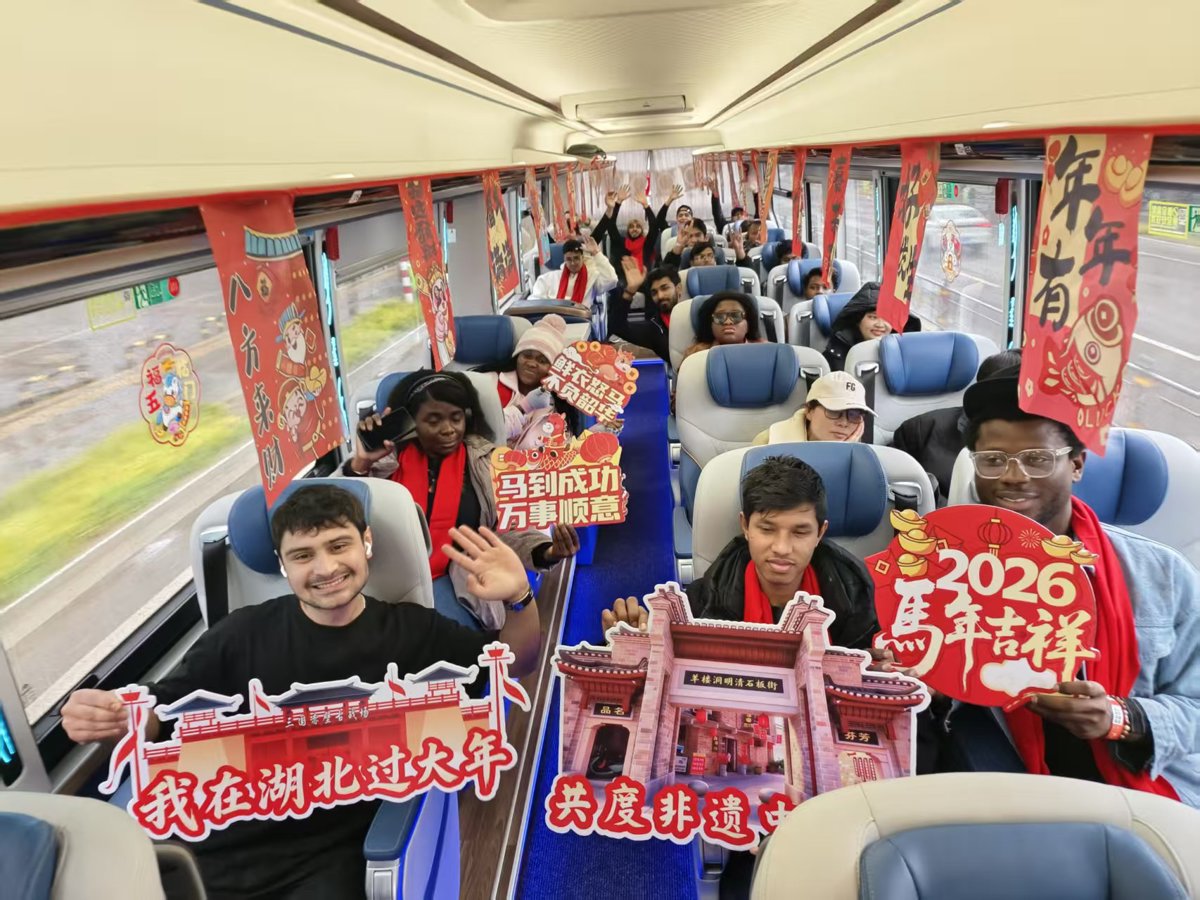 这场“国际范”的年味背后,是咸宁精心策划的“五洲游客共度非遗中国年”活动。来自亚洲、欧洲、非洲11个国家的65位友人,沉浸式体验三国文化、茶道文化和温泉文化,在羊楼洞亲手压制青砖茶,在赤壁古战场学写毛笔字,用不同语言说出“新年快乐”。