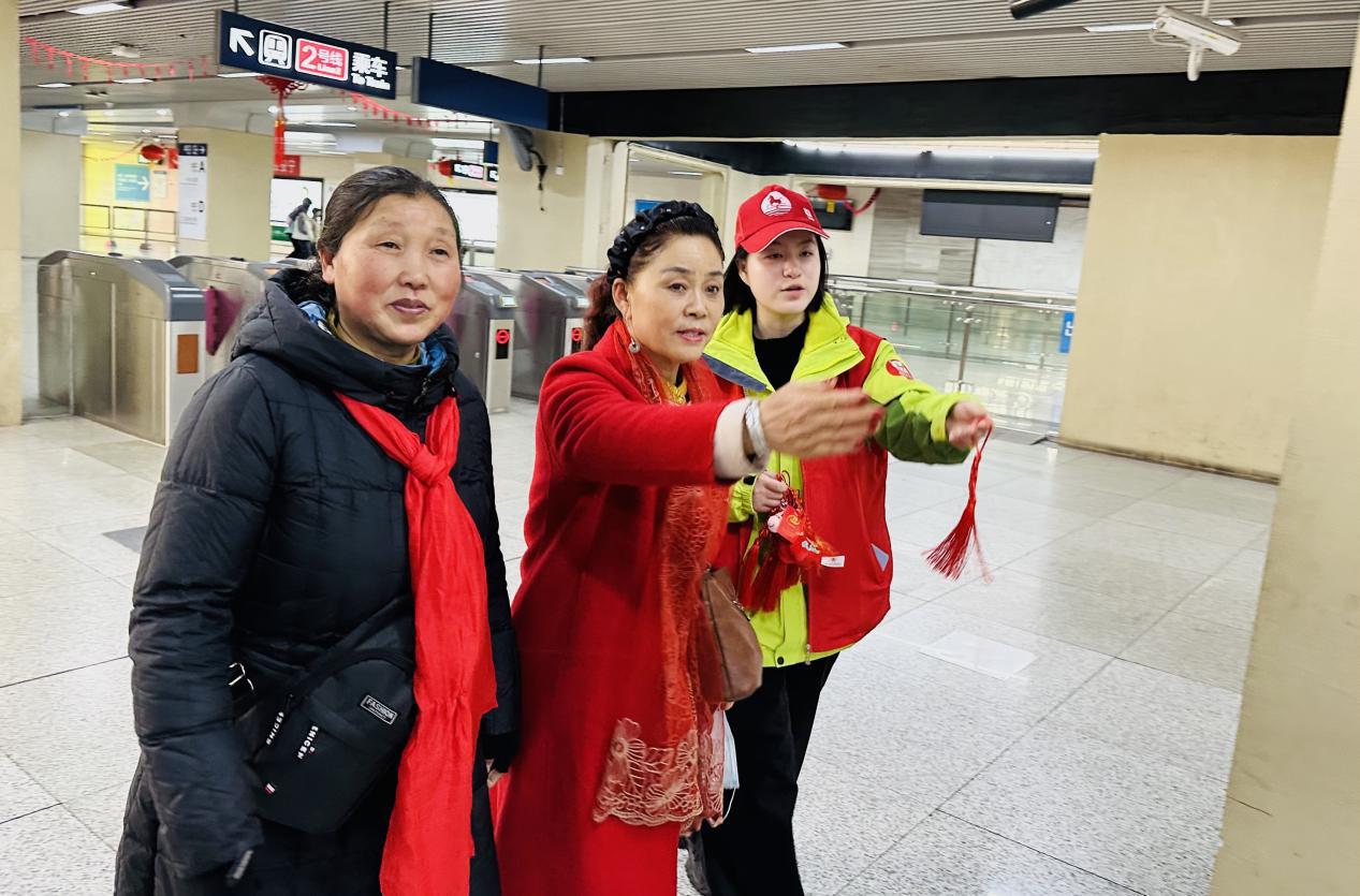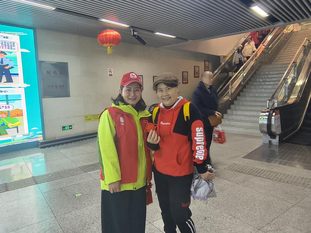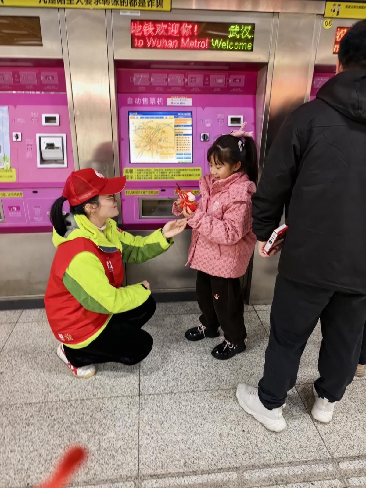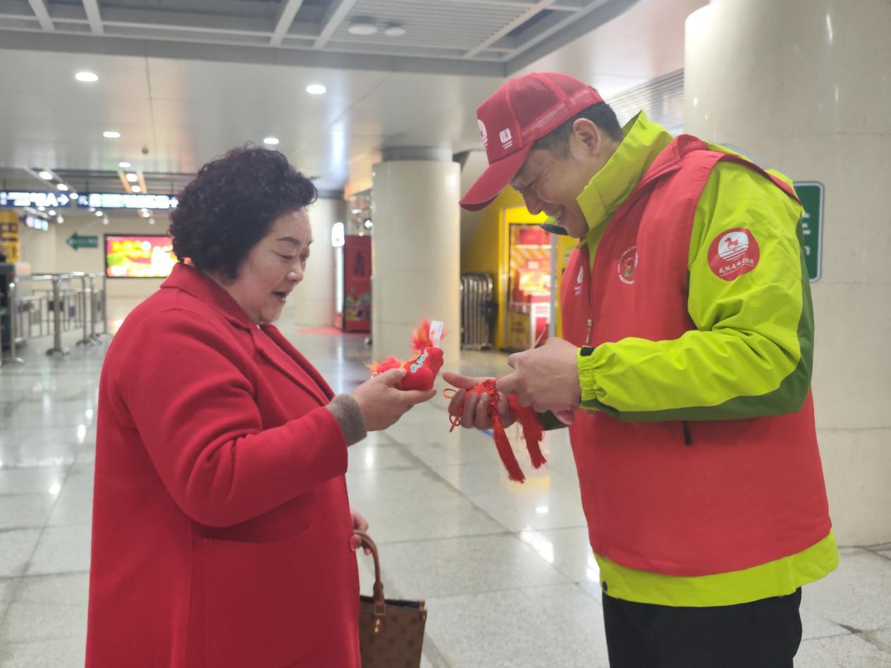 红马甲们分散在售票处、安检口、换乘通道等关键点位,一边为往来乘客送上精致的中国结与福马挂件,传递新春祝福,一边引导乘客有序进站,协助外地乘客购票检票,为携带行李的旅客提供帮助,细致解答路线咨询、周边游玩攻略等问题,用专业与耐心让大家感受到武汉的魅力与温度。