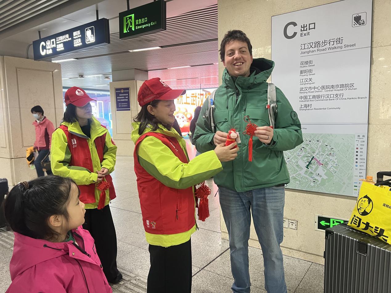 面对过来问询的外国游客,身为资深导游的志愿者陈杰运用流利的英语为其答疑,热情介绍周边景点、美食,并送上象征祝福的中国结,传递武汉温情。