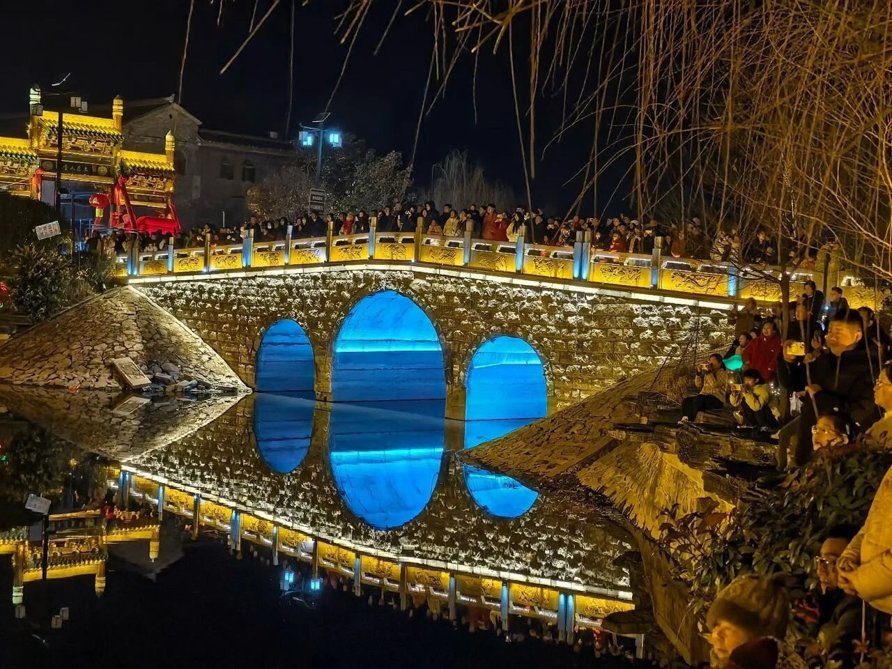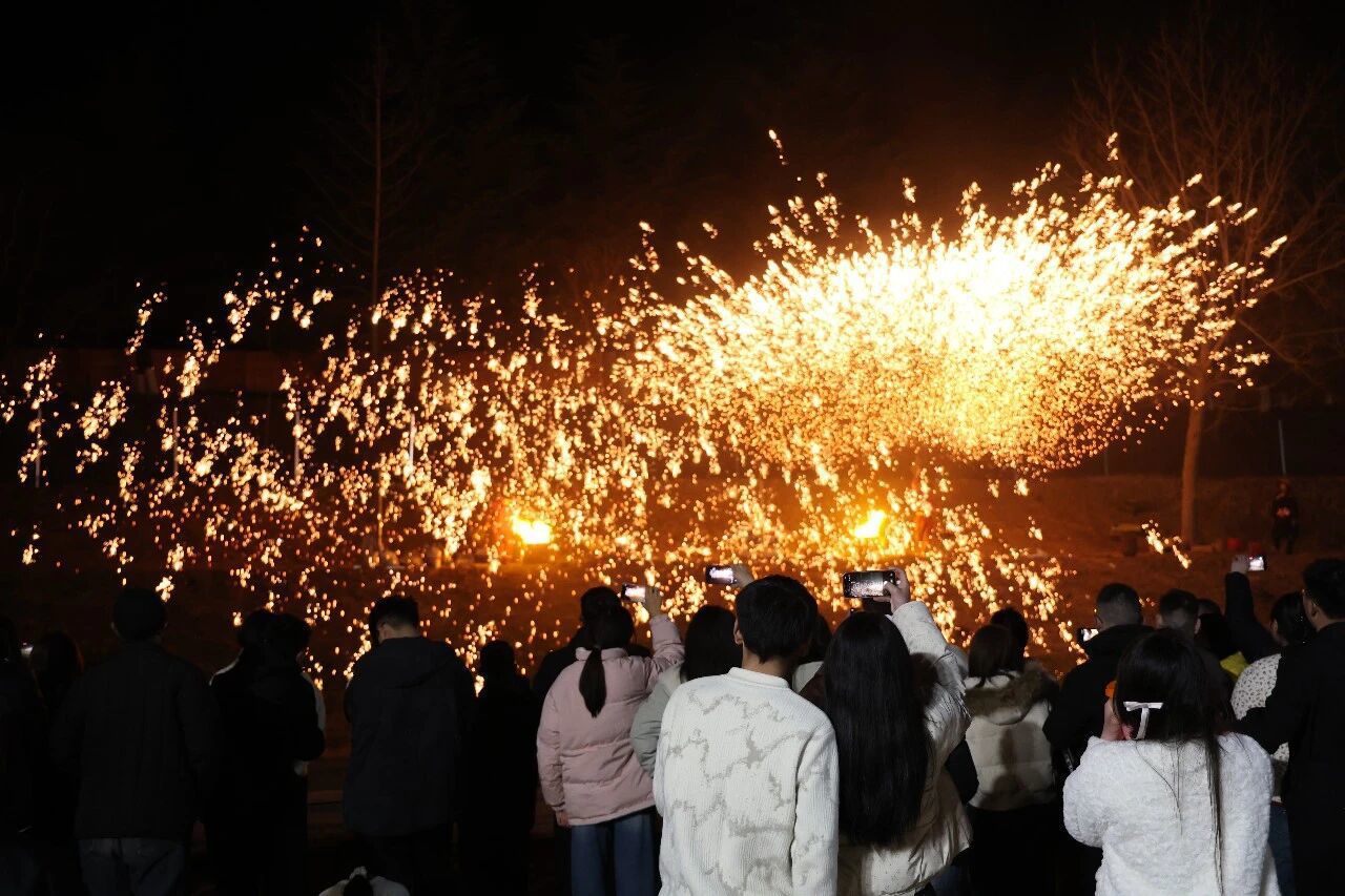 艾山风景区依托“九龙脊”地貌,融合西游、丝绸之路等主题打造分层级灯影景观,光影交错间如梦如幻;沙沟湖水杉公园悬挂数百个诗词灯牌、谜语灯笼,诗词灯谜互动吸引游人驻足;土山古镇新春灯会搭配打铁花、火壶等特色表演,1600℃铁水绽放漫天金花,“火星瀑布”震撼全场,方言演绎的花篮戏更添乡土韵味,让游客感受别样夜游乐趣。