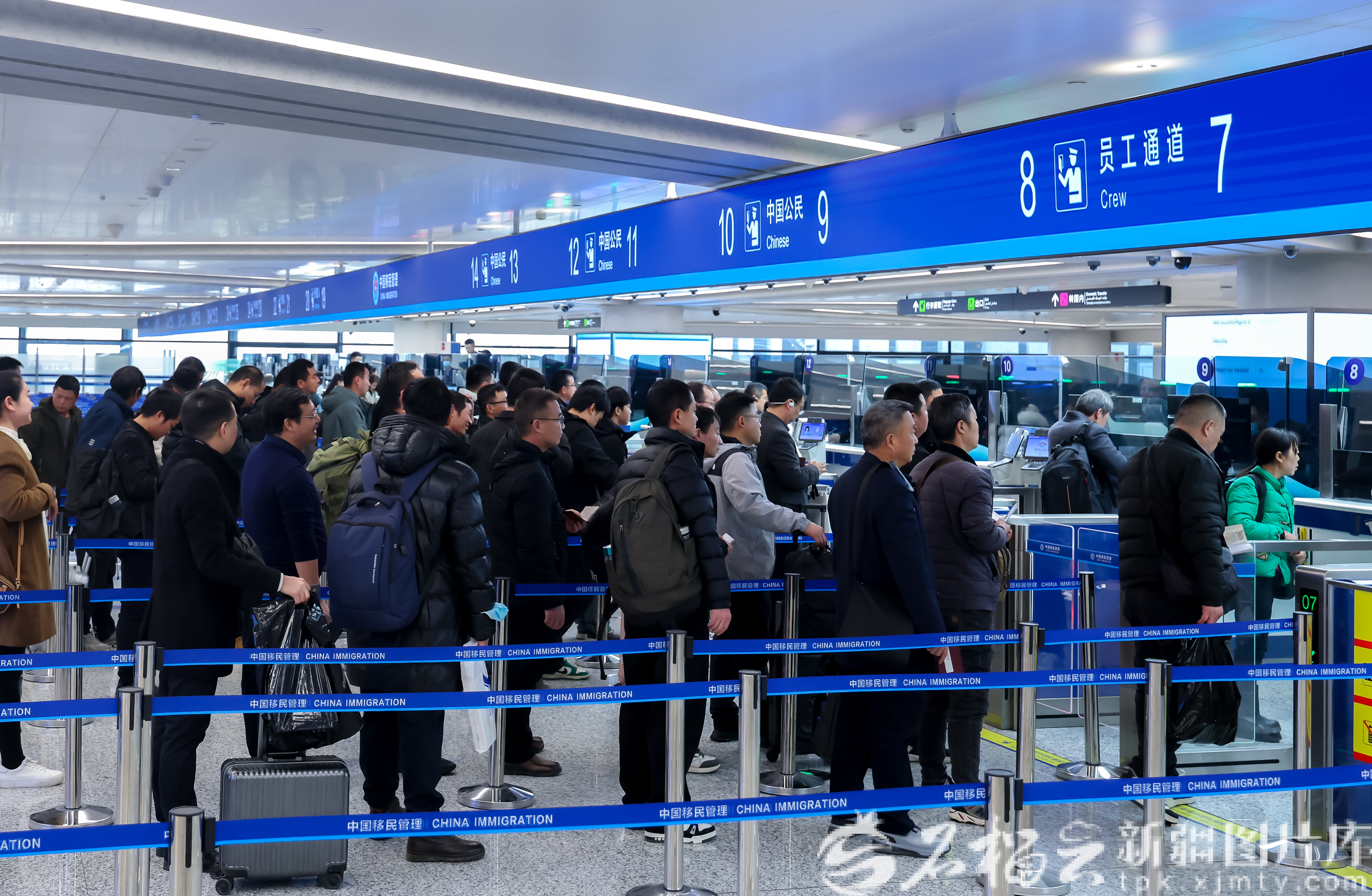 2月17日,在乌鲁木齐天山国际机场,入境旅客有序排队办理手续。郭瑞摄