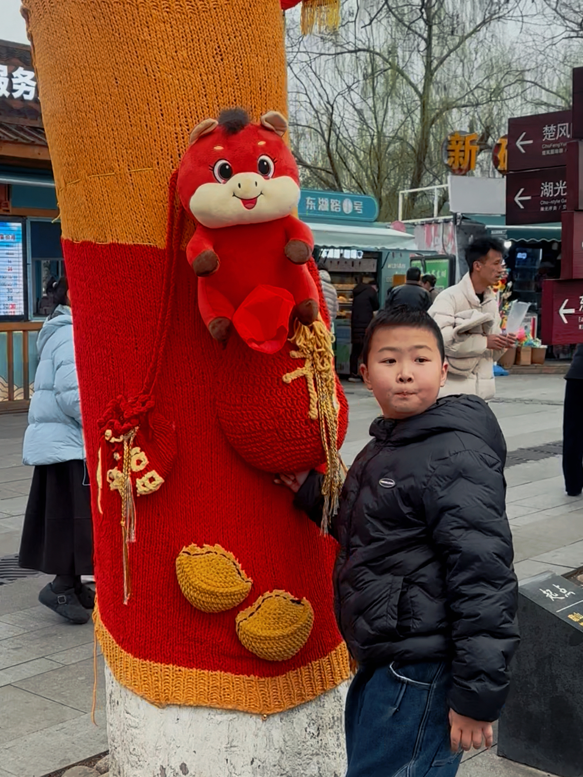 漫步东湖绿道,最吸引眼球的并非传统的红灯笼,而是路边一棵棵“穿”上了彩绘毛衣的大树。记者看到,原本光秃秃的树干被五彩斑斓的“毛衣”包裹,毛衣上绘有小马、笑脸、雪花等可爱的冬日元素。阳光透过枝丫洒在这些“毛衣”上,光影斑驳,为绿道增添了一抹温暖的艺术气息。